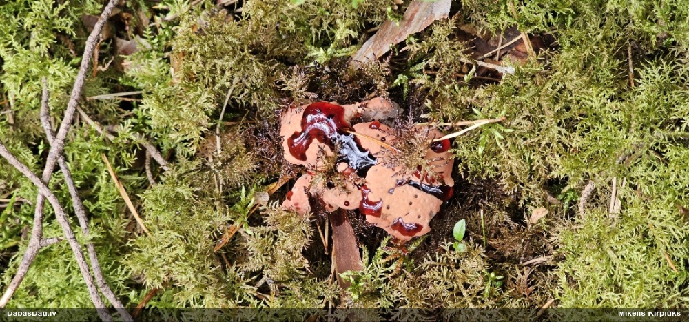 Šis interesants. Uz sausām priedes kritalām rozā mazi līdzīga izskata augļķermeņi maijā aug divām citādi atšķirīgām sugām (dažādās dzimtās) - melnajai plaispikai Amaurochaete atra un trauslajam gļotpūpēdim Reticularia jurana. Pēc sīkām mikropazīmēm (foto nav redzama pat ne sīka balta pakāje ap augļķermeni, un uz virsmas ar lielu piepūli var ja ne saskatīt, tad iztēloties tīklotu virsmas rakstu) izšķīros par biežāko no abām - melno plaispiku, kas tipiski aug samērā atklātās, skrajās vietās, t.sk. nesenos izcirtumos.