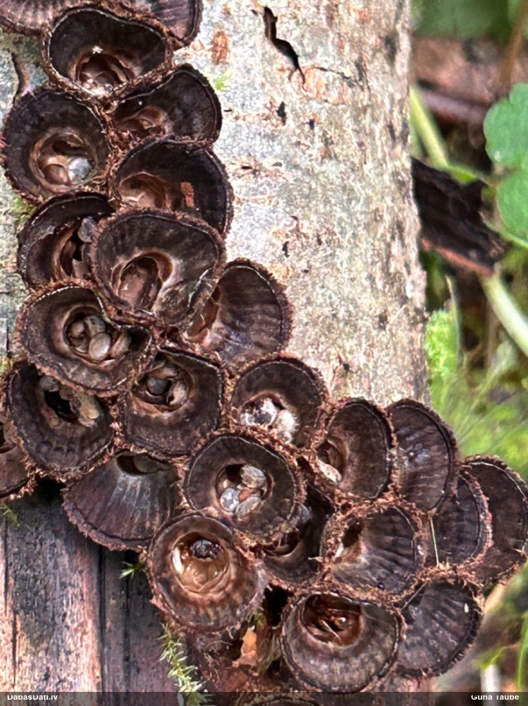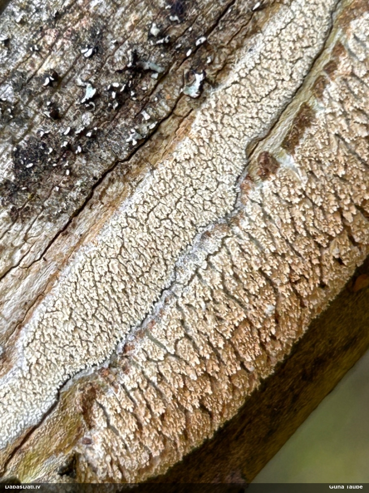 Paldies par paraugu! Paraugā augļķermeņi gan bija ļoti cieti, līdz galam nenobrieduši. Jauna eksemplāra krāsa var būt nozīmīga noteikšanā, bet svarīgi arī nobriedināt (turot mitrākā vietā), citādi perīdiju noņemt mikroskopēšanai ir praktiski neiespējami. Šajā gadījumā mazu gabaliņu izdevās atmiekšķēt un nodabūt, kas sarežģītākos gadījumos varētu būt nepietiekami. Pēc izmēra un perīdija pazīmēm te varētu būt divi varianti L.irregularis un L.epidendrum, kas esot viens no grūtāk atšķiramajiem sugu pāriem. L.epidendrum vairāk raksturīgi, kā es tos saucu, pārstaipi uz augļķermeņa virsmas, kas te ir ļoti labi redzami, tāpēc izšķīros par parastāko sugu.