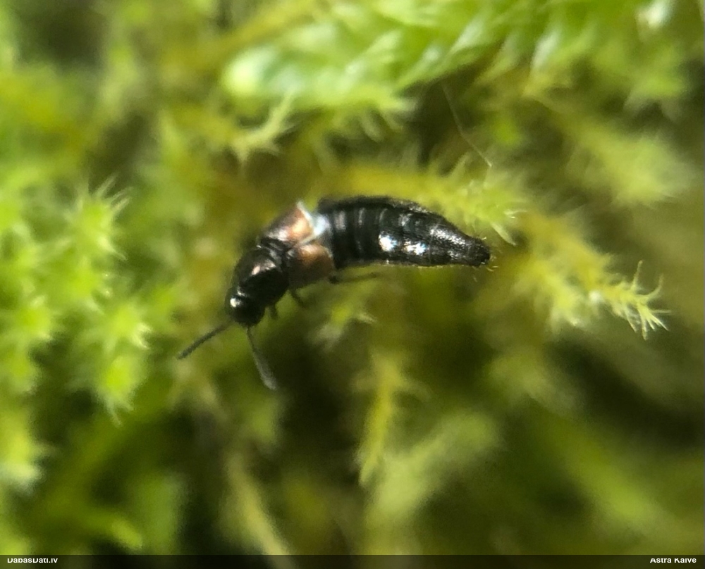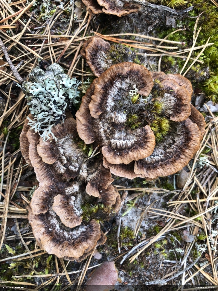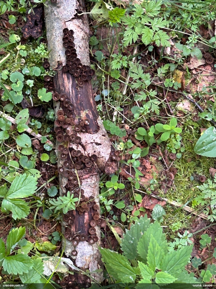 Šis interesants. Uz sausām priedes kritalām rozā mazi līdzīga izskata augļķermeņi maijā aug divām citādi atšķirīgām sugām (dažādās dzimtās) - melnajai plaispikai Amaurochaete atra un trauslajam gļotpūpēdim Reticularia jurana. Pēc sīkām mikropazīmēm (foto nav redzama pat ne sīka balta pakāje ap augļķermeni, un uz virsmas ar lielu piepūli var ja ne saskatīt, tad iztēloties tīklotu virsmas rakstu) izšķīros par biežāko no abām - melno plaispiku, kas tipiski aug samērā atklātās, skrajās vietās, t.sk. nesenos izcirtumos.