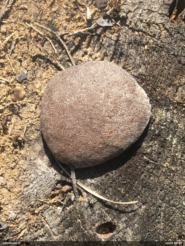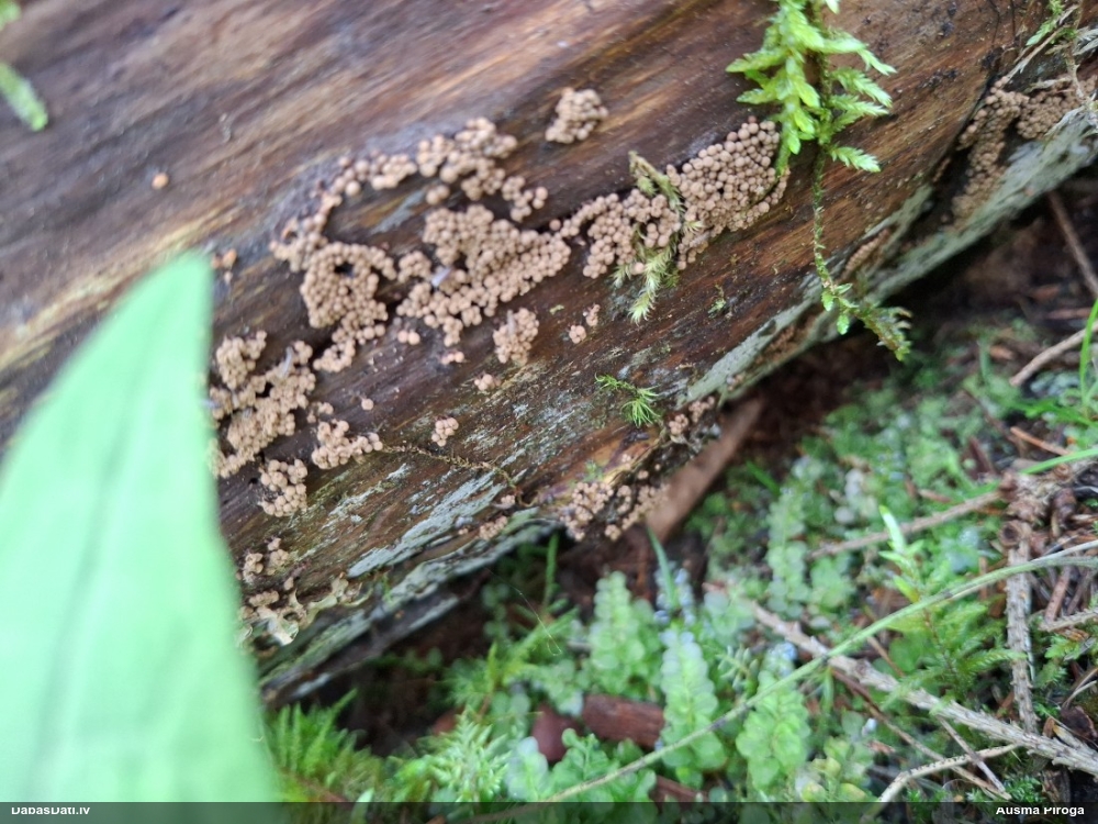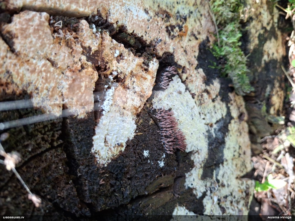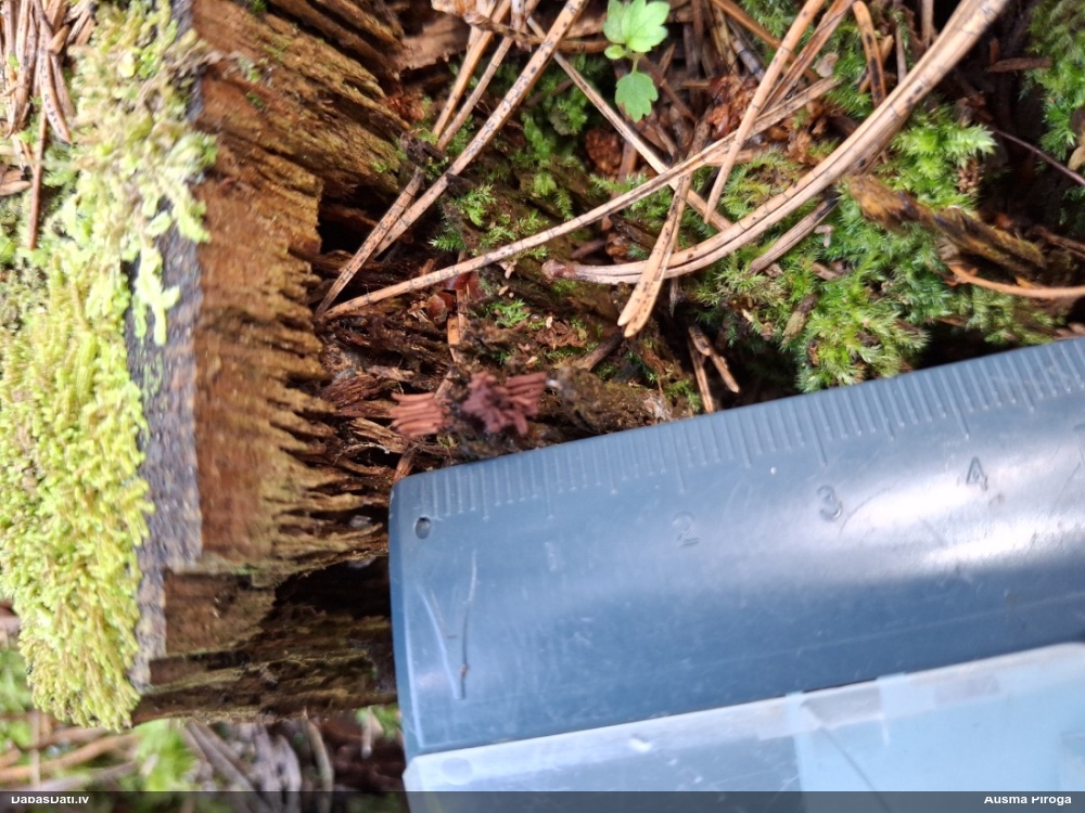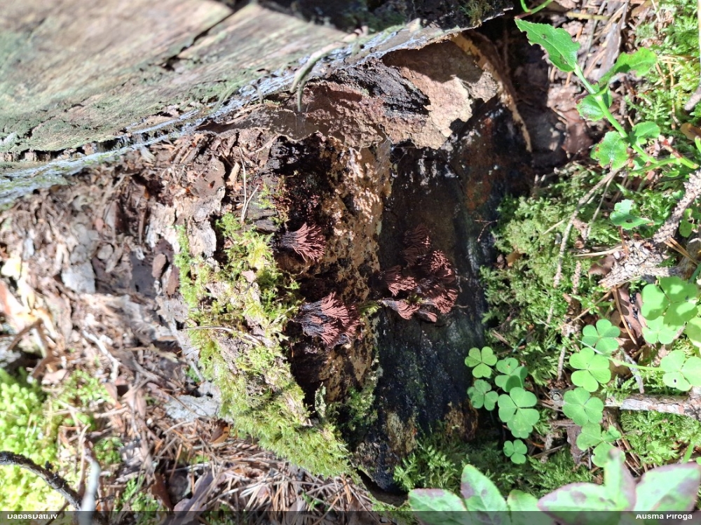 Šis interesants. Uz sausām priedes kritalām rozā mazi līdzīga izskata augļķermeņi maijā aug divām citādi atšķirīgām sugām (dažādās dzimtās) - melnajai plaispikai Amaurochaete atra un trauslajam gļotpūpēdim Reticularia jurana. Pēc sīkām mikropazīmēm (foto nav redzama pat ne sīka balta pakāje ap augļķermeni, un uz virsmas ar lielu piepūli var ja ne saskatīt, tad iztēloties tīklotu virsmas rakstu) izšķīros par biežāko no abām - melno plaispiku, kas tipiski aug samērā atklātās, skrajās vietās, t.sk. nesenos izcirtumos.