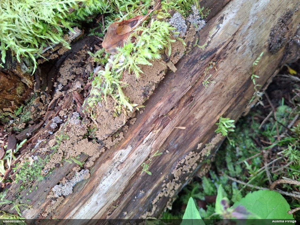 Paldies par paraugu! Paraugā augļķermeņi gan bija ļoti cieti, līdz galam nenobrieduši. Jauna eksemplāra krāsa var būt nozīmīga noteikšanā, bet svarīgi arī nobriedināt (turot mitrākā vietā), citādi perīdiju noņemt mikroskopēšanai ir praktiski neiespējami. Šajā gadījumā mazu gabaliņu izdevās atmiekšķēt un nodabūt, kas sarežģītākos gadījumos varētu būt nepietiekami. Pēc izmēra un perīdija pazīmēm te varētu būt divi varianti L.irregularis un L.epidendrum, kas esot viens no grūtāk atšķiramajiem sugu pāriem. L.epidendrum vairāk raksturīgi, kā es tos saucu, pārstaipi uz augļķermeņa virsmas, kas te ir ļoti labi redzami, tāpēc izšķīros par parastāko sugu.