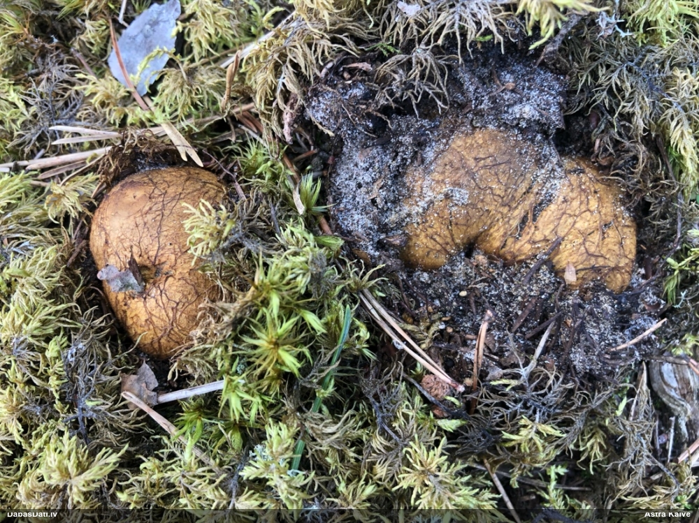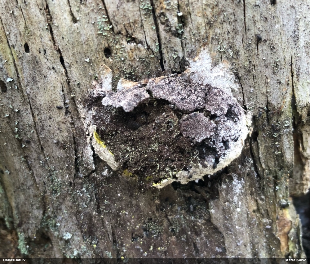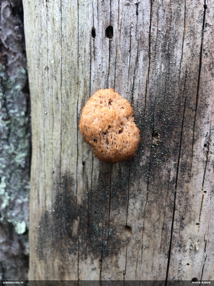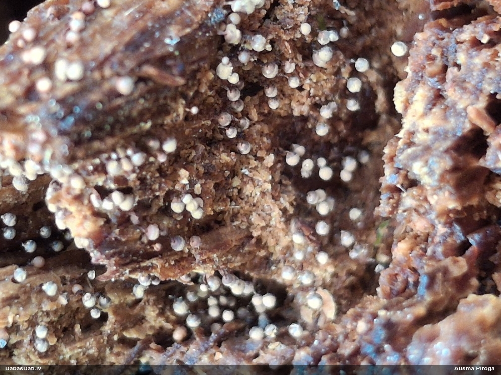 Paldies par paraugu! Paraugā augļķermeņi gan bija ļoti cieti, līdz galam nenobrieduši. Jauna eksemplāra krāsa var būt nozīmīga noteikšanā, bet svarīgi arī nobriedināt (turot mitrākā vietā), citādi perīdiju noņemt mikroskopēšanai ir praktiski neiespējami. Šajā gadījumā mazu gabaliņu izdevās atmiekšķēt un nodabūt, kas sarežģītākos gadījumos varētu būt nepietiekami. Pēc izmēra un perīdija pazīmēm te varētu būt divi varianti L.irregularis un L.epidendrum, kas esot viens no grūtāk atšķiramajiem sugu pāriem. L.epidendrum vairāk raksturīgi, kā es tos saucu, pārstaipi uz augļķermeņa virsmas, kas te ir ļoti labi redzami, tāpēc izšķīros par parastāko sugu.