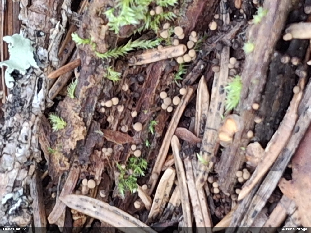 Šis interesants. Uz sausām priedes kritalām rozā mazi līdzīga izskata augļķermeņi maijā aug divām citādi atšķirīgām sugām (dažādās dzimtās) - melnajai plaispikai Amaurochaete atra un trauslajam gļotpūpēdim Reticularia jurana. Pēc sīkām mikropazīmēm (foto nav redzama pat ne sīka balta pakāje ap augļķermeni, un uz virsmas ar lielu piepūli var ja ne saskatīt, tad iztēloties tīklotu virsmas rakstu) izšķīros par biežāko no abām - melno plaispiku, kas tipiski aug samērā atklātās, skrajās vietās, t.sk. nesenos izcirtumos.