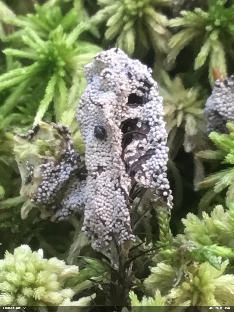 neatceros, kad tik ļoti nevarējusi sagaidīt mikroskopēšanu savam paraugam, kas identisks ar šo novērojumu. Mizaine ir. Vistuvāk no tā, ko paguvu izpētīt, tiešām kārpainā mizaine, bet kapilīcijs, manuprāt, ir mazliet citādāks, nemaz nerunājot par to, ka tā ļoti daudz un pat staipīgs (kārpainajai kapilīcijs maz un nestaipās). Un Neuberta aprakstā tikko iztulkoju par substrātu "Tā substrāts ir gandrīz tikai lapu koku miza, tikai vienā Picea gadījumā, dažreiz arī uz sūnām". Bet mums abām ir pārliecinošas egles un kopīgs izskats, kas atšķiras no kārpainās, nu neticu, ka varētu būt kārpainā. Ticamāk, ka zinātnei jauna suga :D. bet es vēl papētīšu, varbūt kaut kur tomēr ir kas tāds aprakstīts.