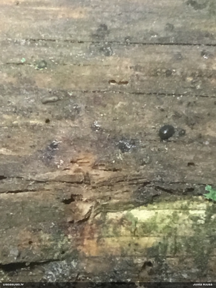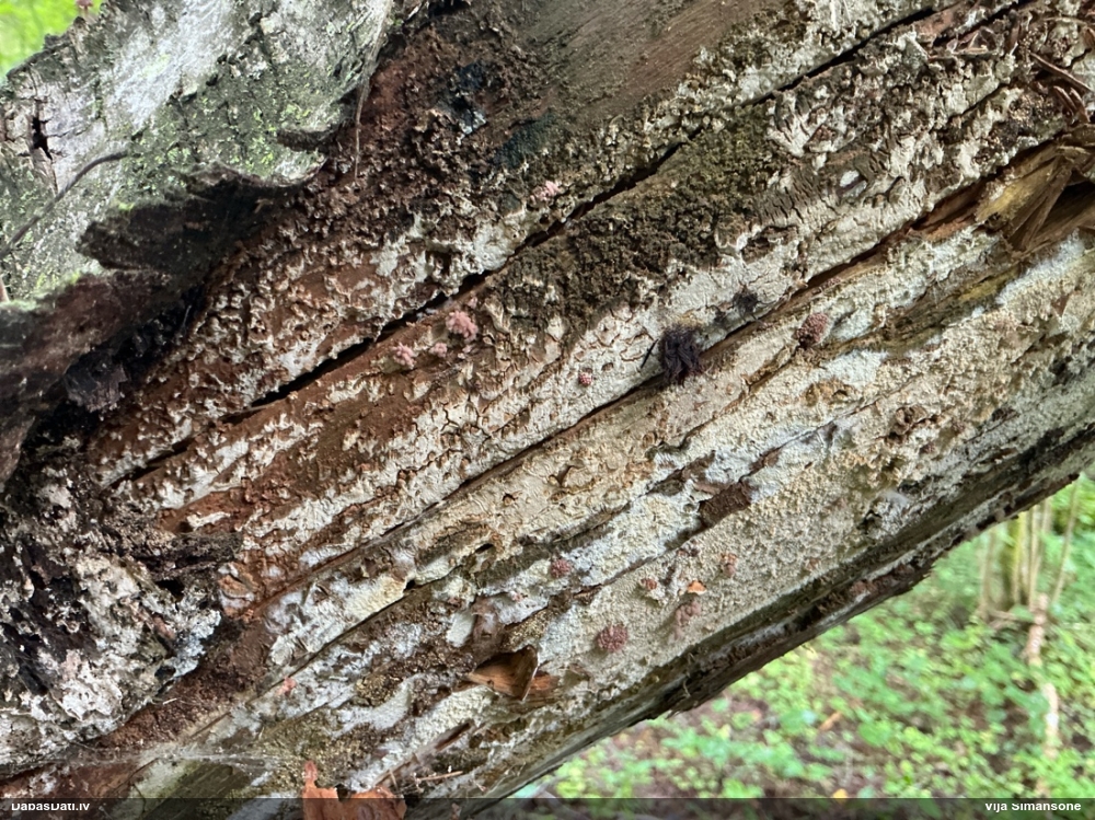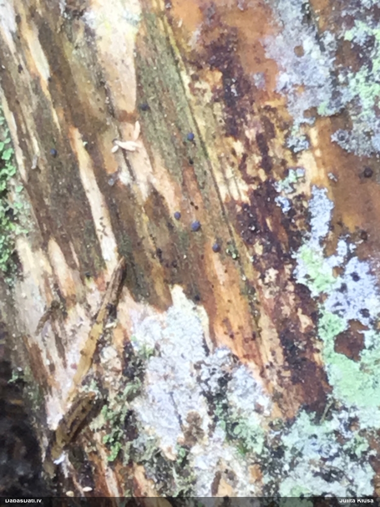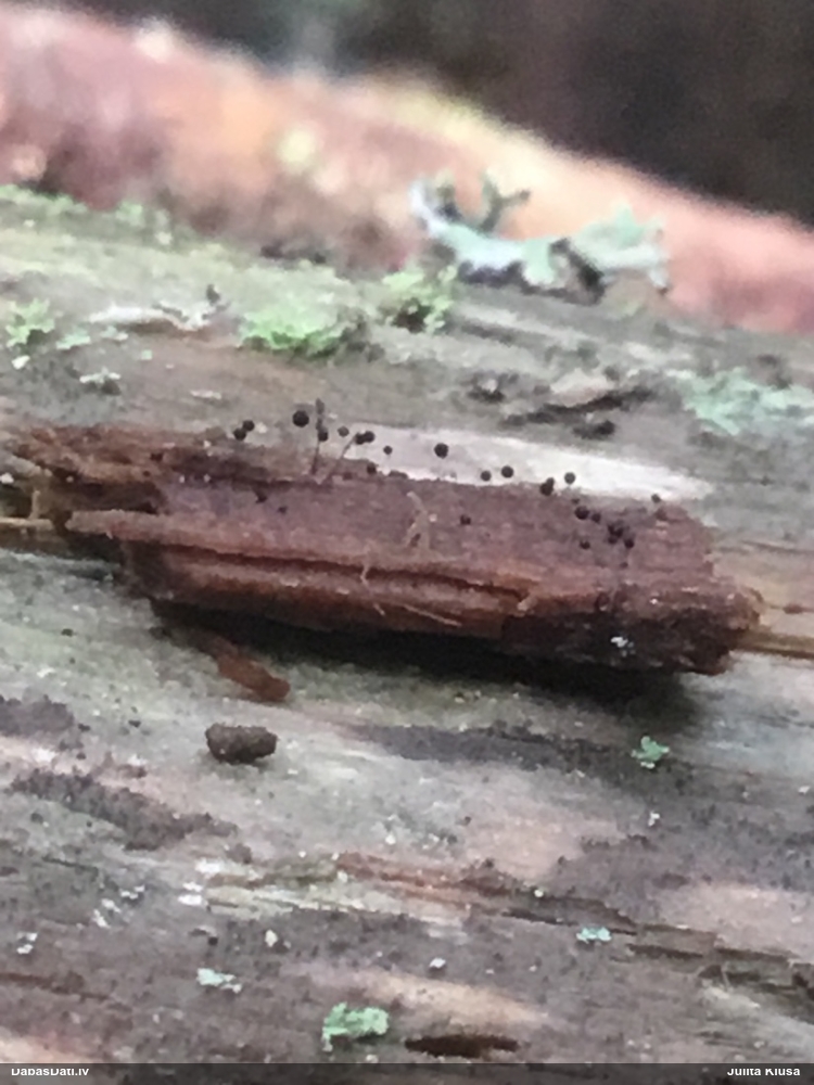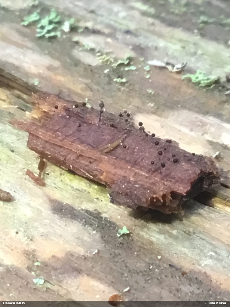 Šis interesants. Uz sausām priedes kritalām rozā mazi līdzīga izskata augļķermeņi maijā aug divām citādi atšķirīgām sugām (dažādās dzimtās) - melnajai plaispikai Amaurochaete atra un trauslajam gļotpūpēdim Reticularia jurana. Pēc sīkām mikropazīmēm (foto nav redzama pat ne sīka balta pakāje ap augļķermeni, un uz virsmas ar lielu piepūli var ja ne saskatīt, tad iztēloties tīklotu virsmas rakstu) izšķīros par biežāko no abām - melno plaispiku, kas tipiski aug samērā atklātās, skrajās vietās, t.sk. nesenos izcirtumos.