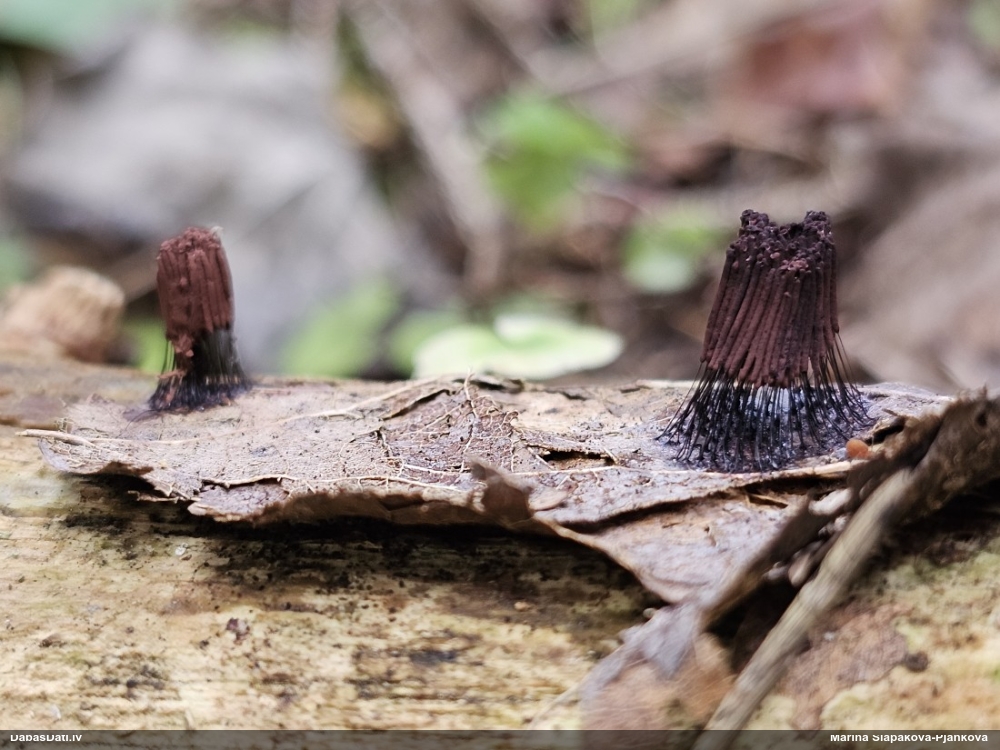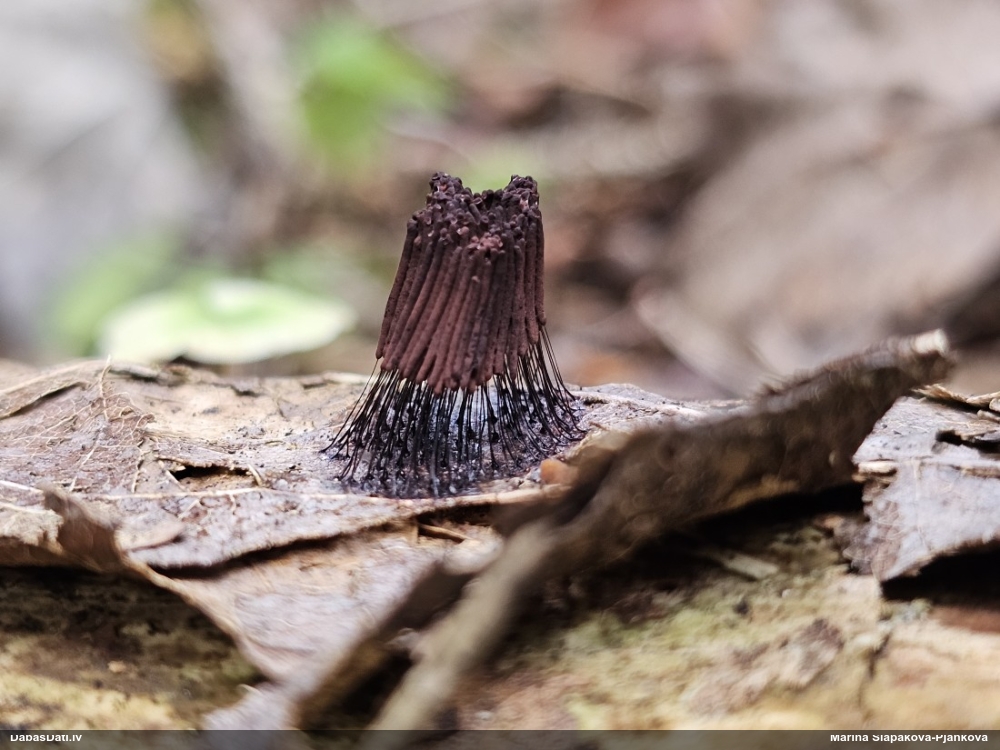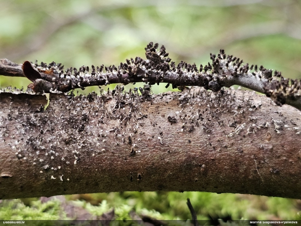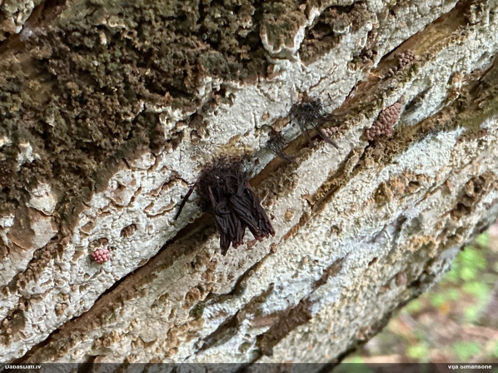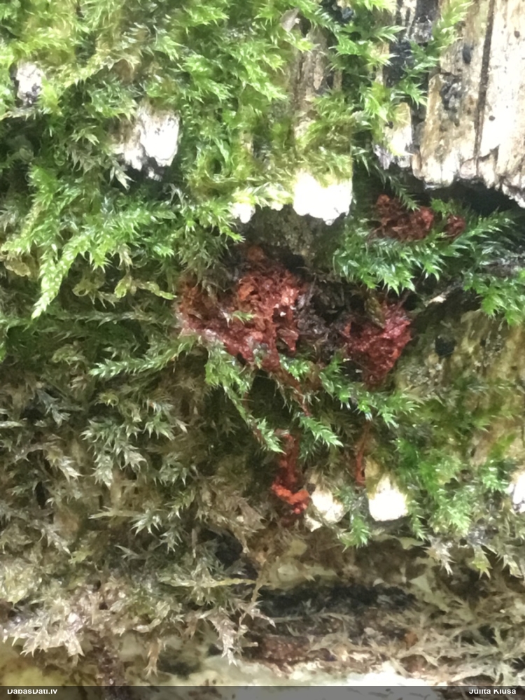 Šis interesants. Uz sausām priedes kritalām rozā mazi līdzīga izskata augļķermeņi maijā aug divām citādi atšķirīgām sugām (dažādās dzimtās) - melnajai plaispikai Amaurochaete atra un trauslajam gļotpūpēdim Reticularia jurana. Pēc sīkām mikropazīmēm (foto nav redzama pat ne sīka balta pakāje ap augļķermeni, un uz virsmas ar lielu piepūli var ja ne saskatīt, tad iztēloties tīklotu virsmas rakstu) izšķīros par biežāko no abām - melno plaispiku, kas tipiski aug samērā atklātās, skrajās vietās, t.sk. nesenos izcirtumos.