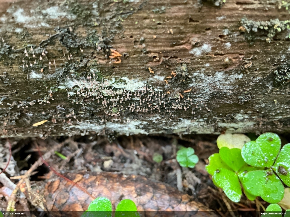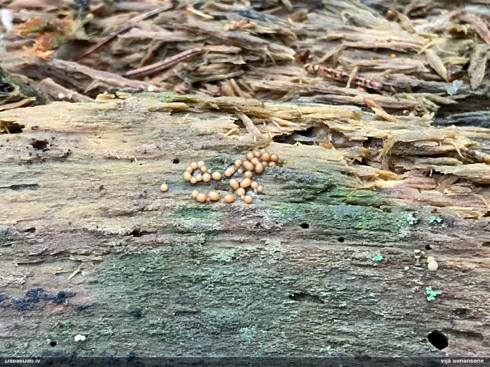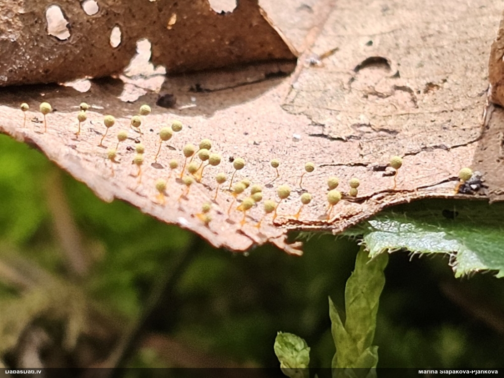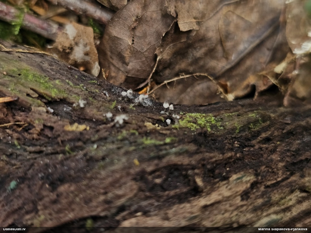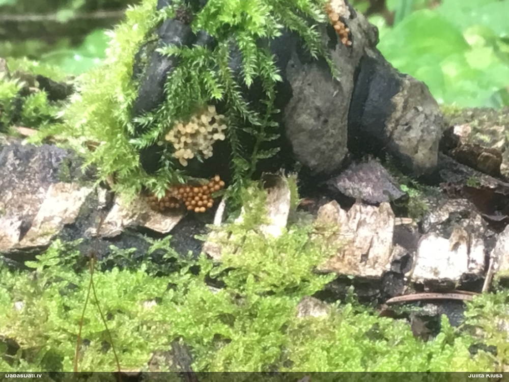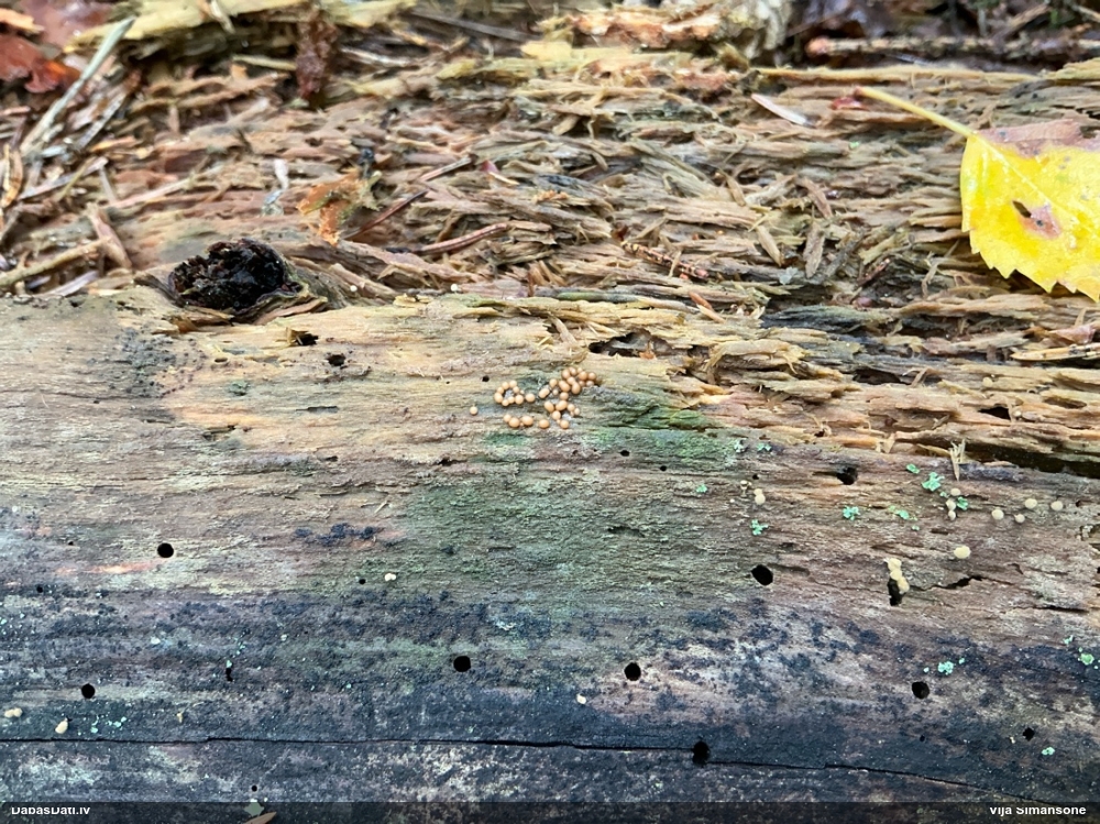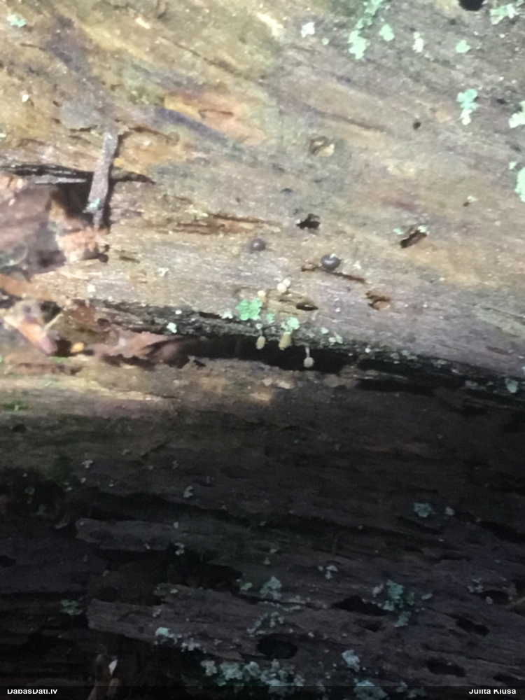 Paldies, Raivo! Ar acu gaišumu man arvien sliktāk, bet mikroskops palīdz. Jā, gribēju teikt, ka paraugam, ja vien nav kāda jutīga atradne, kurai drīkst ievākt tikai mazu gabaliņu, vērts ievākt lielāku gabalu, jo gļotsēnēm patīk kompānija. Un mikroskopa mazajos palielinājumos ar sānu papildus apgaismojumu ir vērts rūpīgi "izstaigāt" visu paraugu. Arī ķērpjus un interesantas sīksēnītes tā var atrast, ko dabā nepamanītu. Ar kriksītēm ir dažādi - pirmās es tā arī tikai citu sugu paraugos pamanīju, bet vēlāk redzēju arī dabā kriskīšu plantācijas - ja to ir daudz, tad var pamanīt jau dabā. Uz sūnām gan ir ekstrēms gadījums, dabā droši nepamanītu, arī eksemplāra noņemšana no sūnas nebija pārāk veiksmīga, tāpēc par noteikšanu mazliet šaubos (sporām mazliet cits tonis). Bet pagaidām citas hipotēzes nav (un konkrētā eksemplāra arī vairs ne).