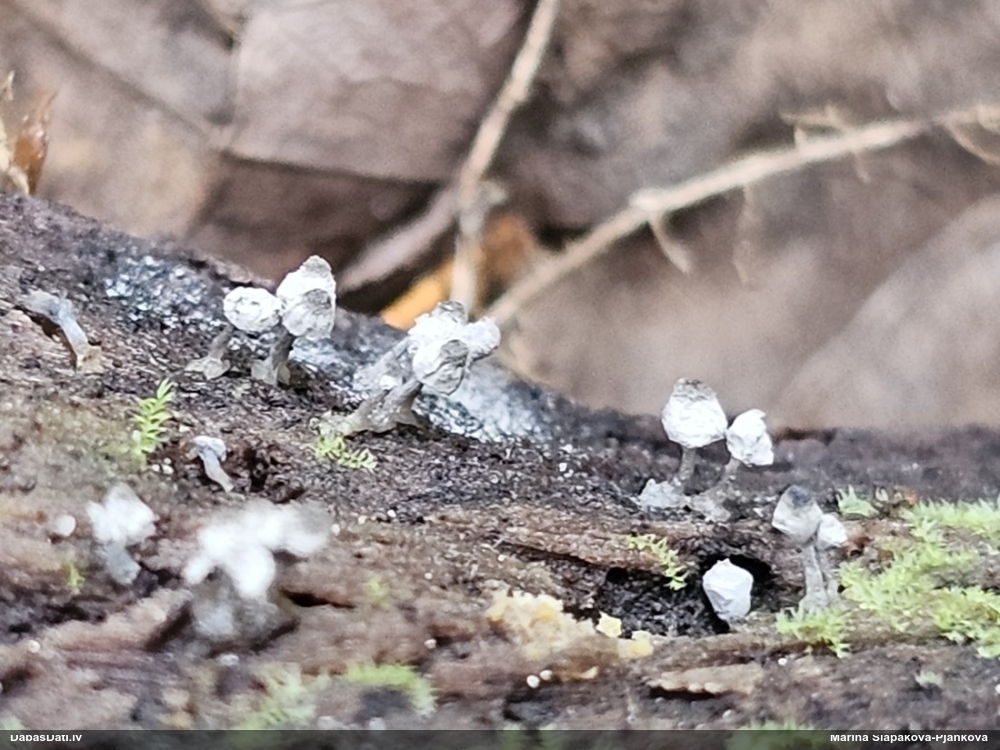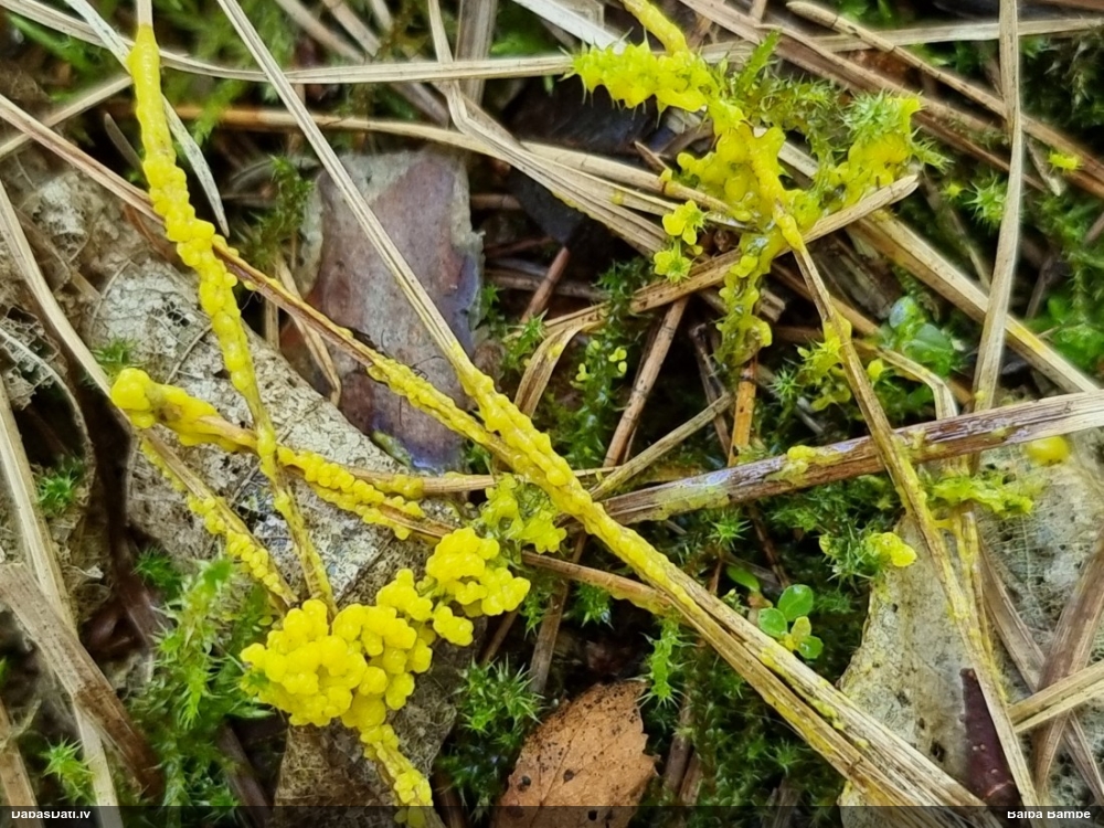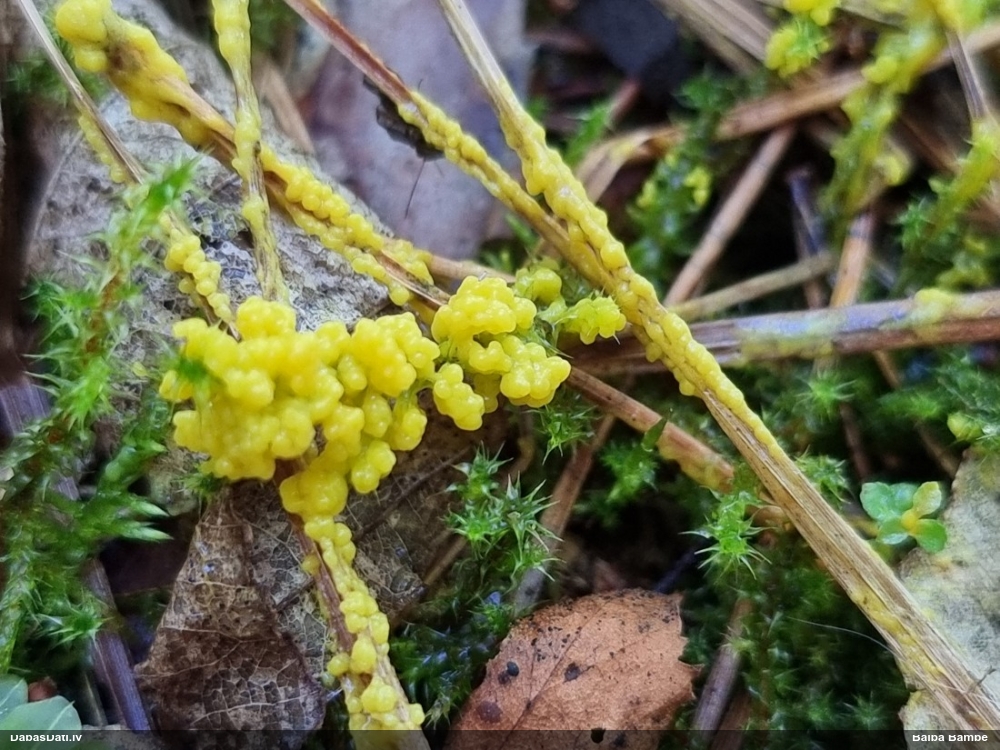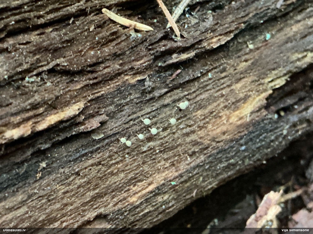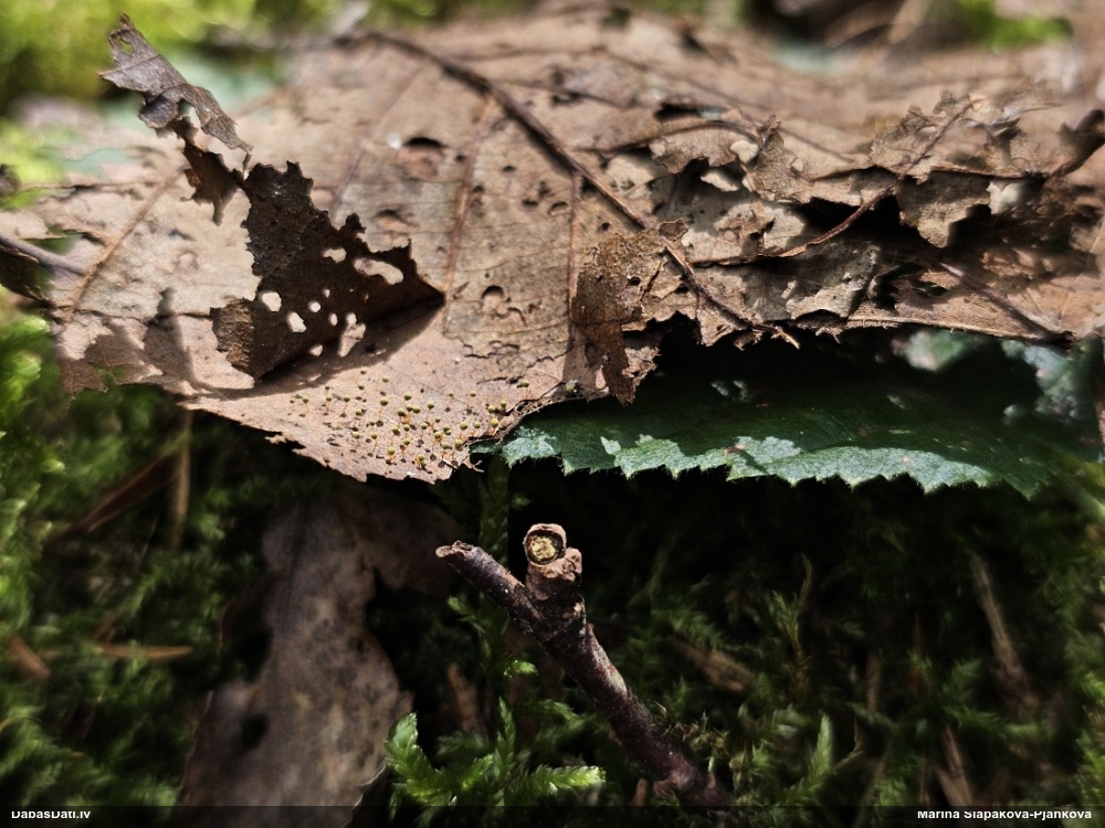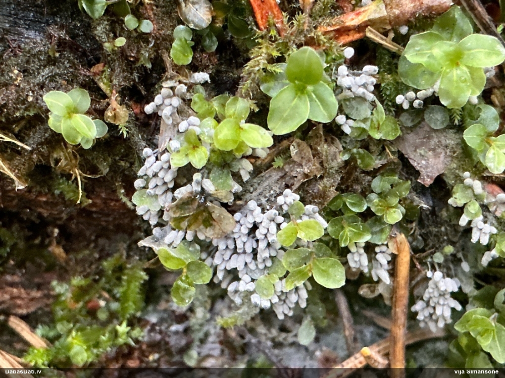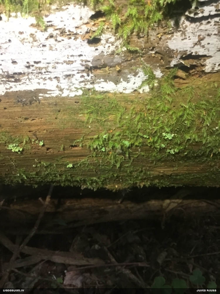 Paldies, Raivo! Ar acu gaišumu man arvien sliktāk, bet mikroskops palīdz. Jā, gribēju teikt, ka paraugam, ja vien nav kāda jutīga atradne, kurai drīkst ievākt tikai mazu gabaliņu, vērts ievākt lielāku gabalu, jo gļotsēnēm patīk kompānija. Un mikroskopa mazajos palielinājumos ar sānu papildus apgaismojumu ir vērts rūpīgi "izstaigāt" visu paraugu. Arī ķērpjus un interesantas sīksēnītes tā var atrast, ko dabā nepamanītu. Ar kriksītēm ir dažādi - pirmās es tā arī tikai citu sugu paraugos pamanīju, bet vēlāk redzēju arī dabā kriskīšu plantācijas - ja to ir daudz, tad var pamanīt jau dabā. Uz sūnām gan ir ekstrēms gadījums, dabā droši nepamanītu, arī eksemplāra noņemšana no sūnas nebija pārāk veiksmīga, tāpēc par noteikšanu mazliet šaubos (sporām mazliet cits tonis). Bet pagaidām citas hipotēzes nav (un konkrētā eksemplāra arī vairs ne).
