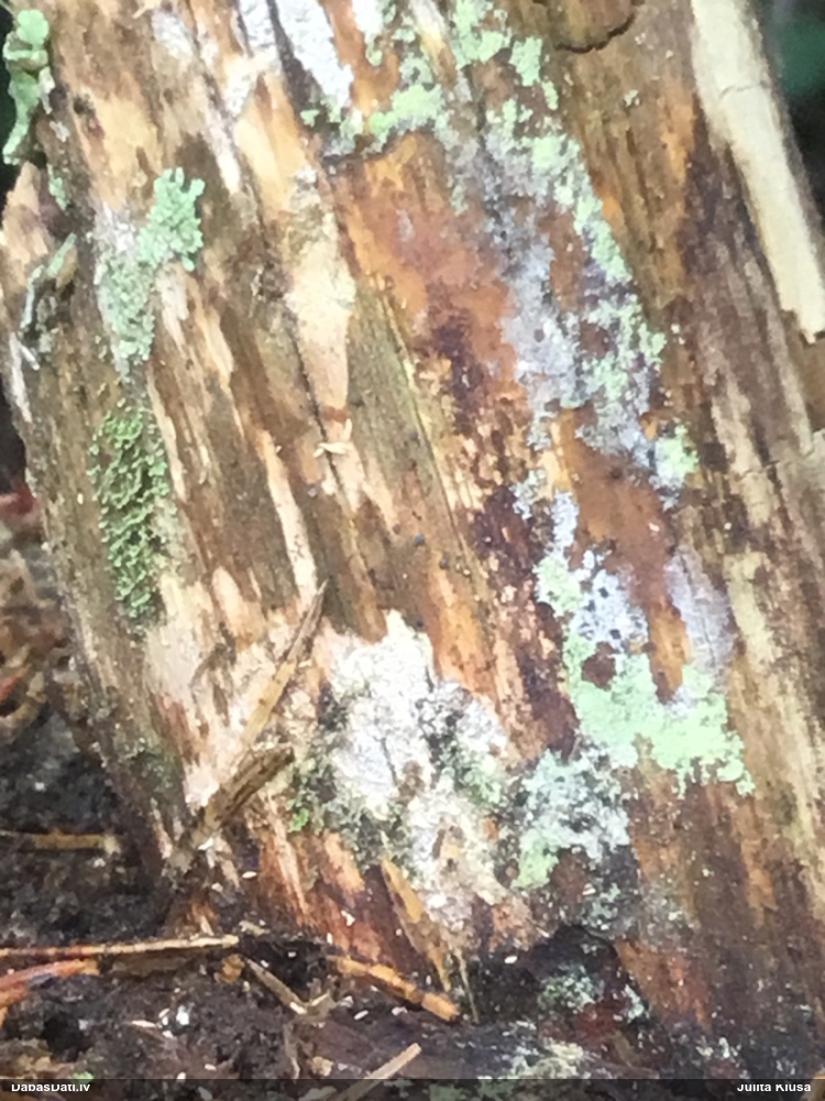 neatceros, kad tik ļoti nevarējusi sagaidīt mikroskopēšanu savam paraugam, kas identisks ar šo novērojumu. Mizaine ir. Vistuvāk no tā, ko paguvu izpētīt, tiešām kārpainā mizaine, bet kapilīcijs, manuprāt, ir mazliet citādāks, nemaz nerunājot par to, ka tā ļoti daudz un pat staipīgs (kārpainajai kapilīcijs maz un nestaipās). Un Neuberta aprakstā tikko iztulkoju par substrātu "Tā substrāts ir gandrīz tikai lapu koku miza, tikai vienā Picea gadījumā, dažreiz arī uz sūnām". Bet mums abām ir pārliecinošas egles un kopīgs izskats, kas atšķiras no kārpainās, nu neticu, ka varētu būt kārpainā. Ticamāk, ka zinātnei jauna suga :D. bet es vēl papētīšu, varbūt kaut kur tomēr ir kas tāds aprakstīts.