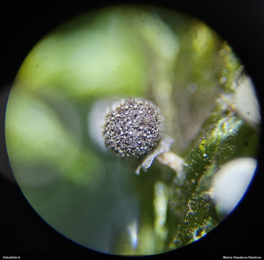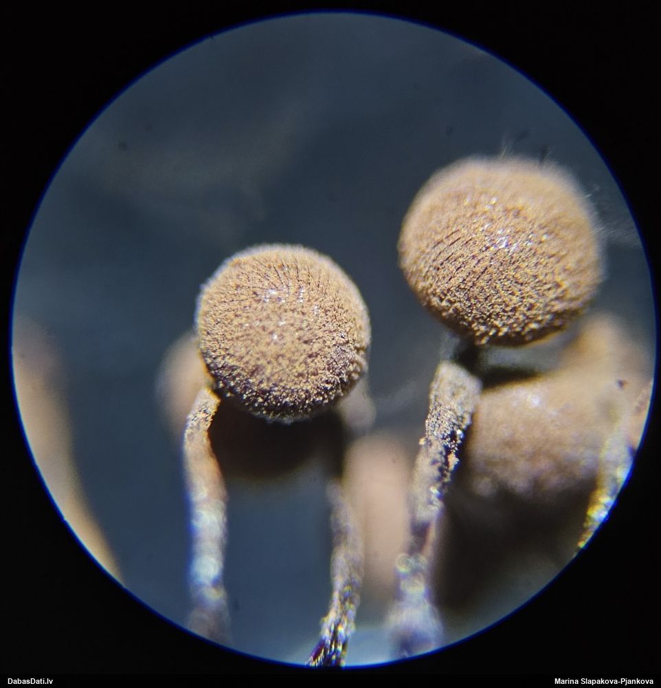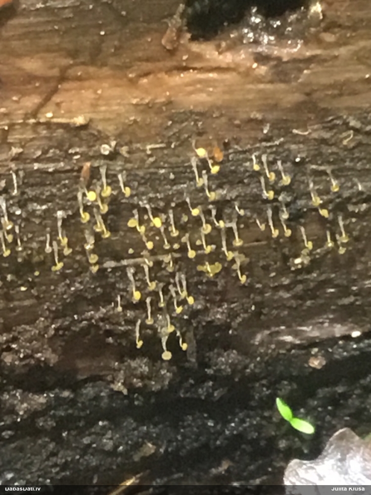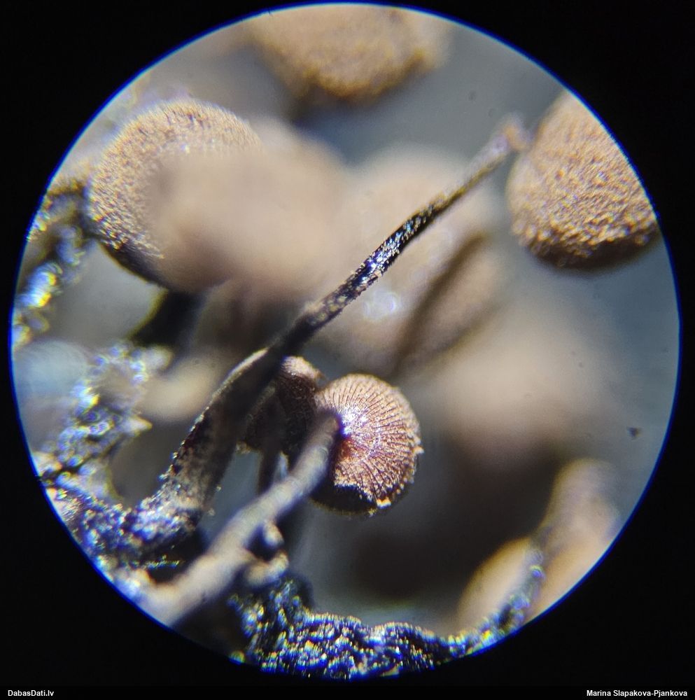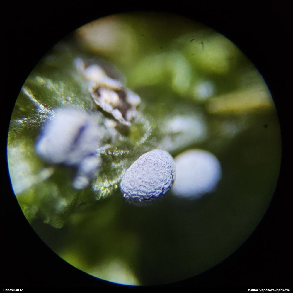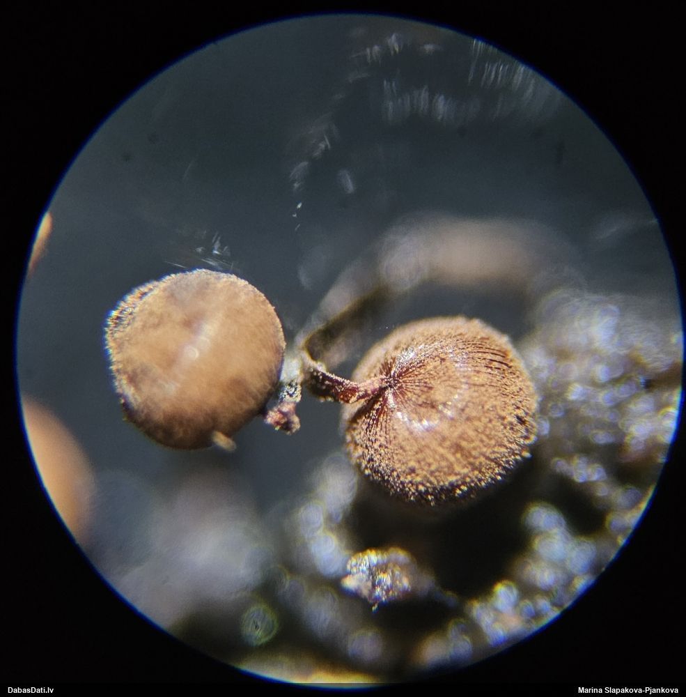 Paldies, Raivo! Ar acu gaišumu man arvien sliktāk, bet mikroskops palīdz. Jā, gribēju teikt, ka paraugam, ja vien nav kāda jutīga atradne, kurai drīkst ievākt tikai mazu gabaliņu, vērts ievākt lielāku gabalu, jo gļotsēnēm patīk kompānija. Un mikroskopa mazajos palielinājumos ar sānu papildus apgaismojumu ir vērts rūpīgi "izstaigāt" visu paraugu. Arī ķērpjus un interesantas sīksēnītes tā var atrast, ko dabā nepamanītu. Ar kriksītēm ir dažādi - pirmās es tā arī tikai citu sugu paraugos pamanīju, bet vēlāk redzēju arī dabā kriskīšu plantācijas - ja to ir daudz, tad var pamanīt jau dabā. Uz sūnām gan ir ekstrēms gadījums, dabā droši nepamanītu, arī eksemplāra noņemšana no sūnas nebija pārāk veiksmīga, tāpēc par noteikšanu mazliet šaubos (sporām mazliet cits tonis). Bet pagaidām citas hipotēzes nav (un konkrētā eksemplāra arī vairs ne).