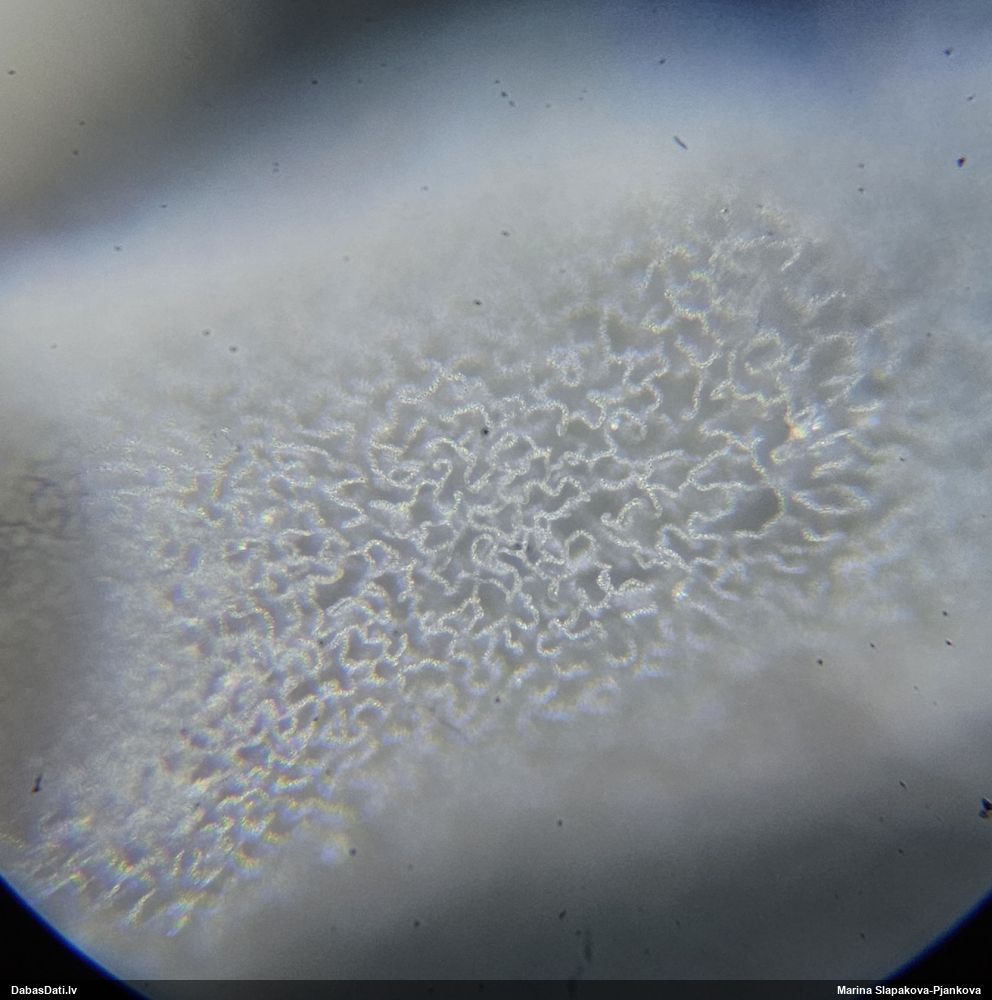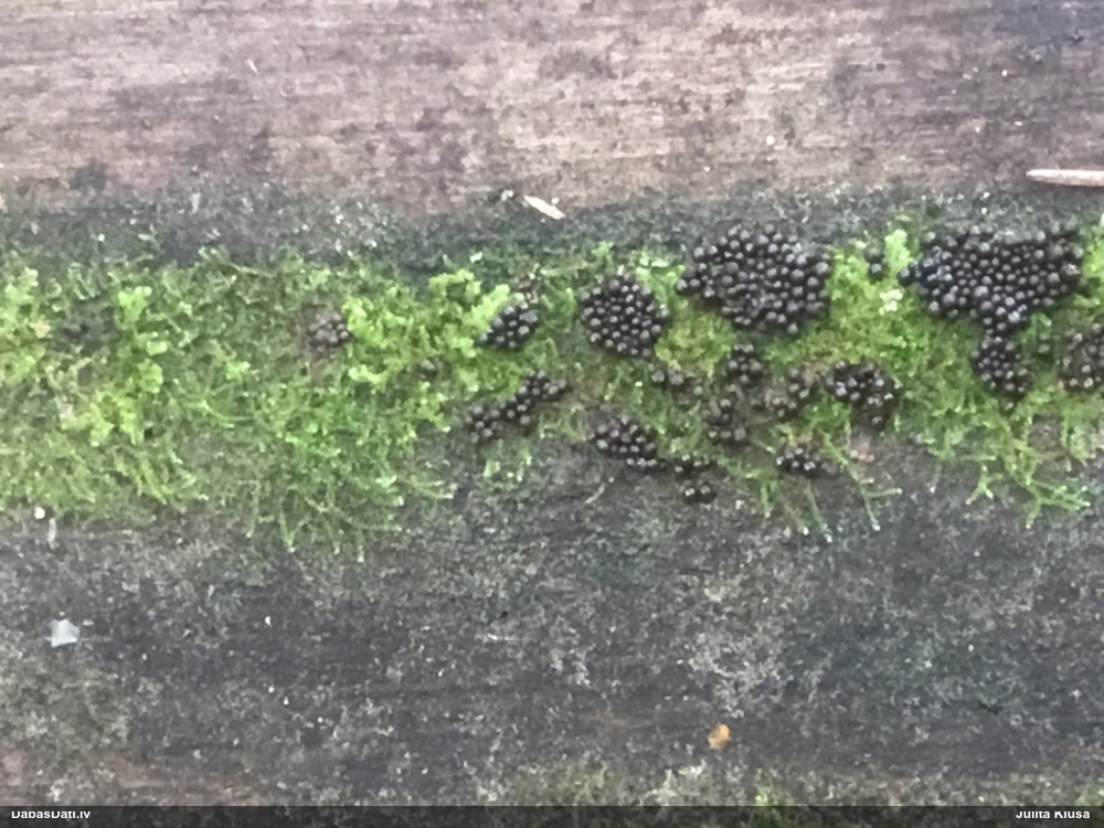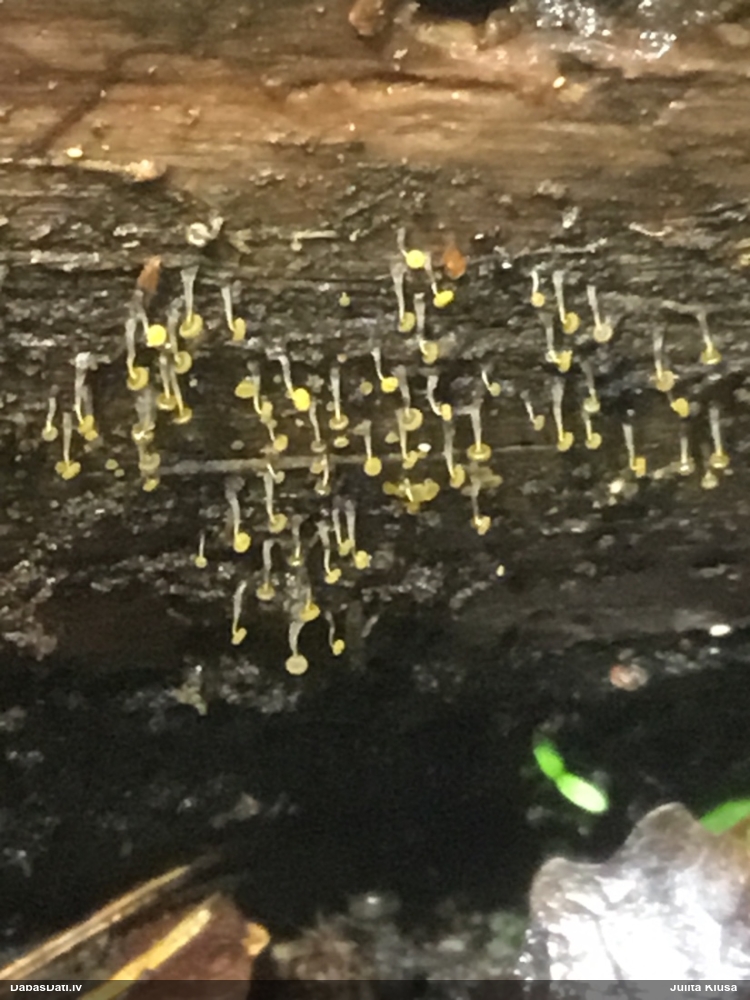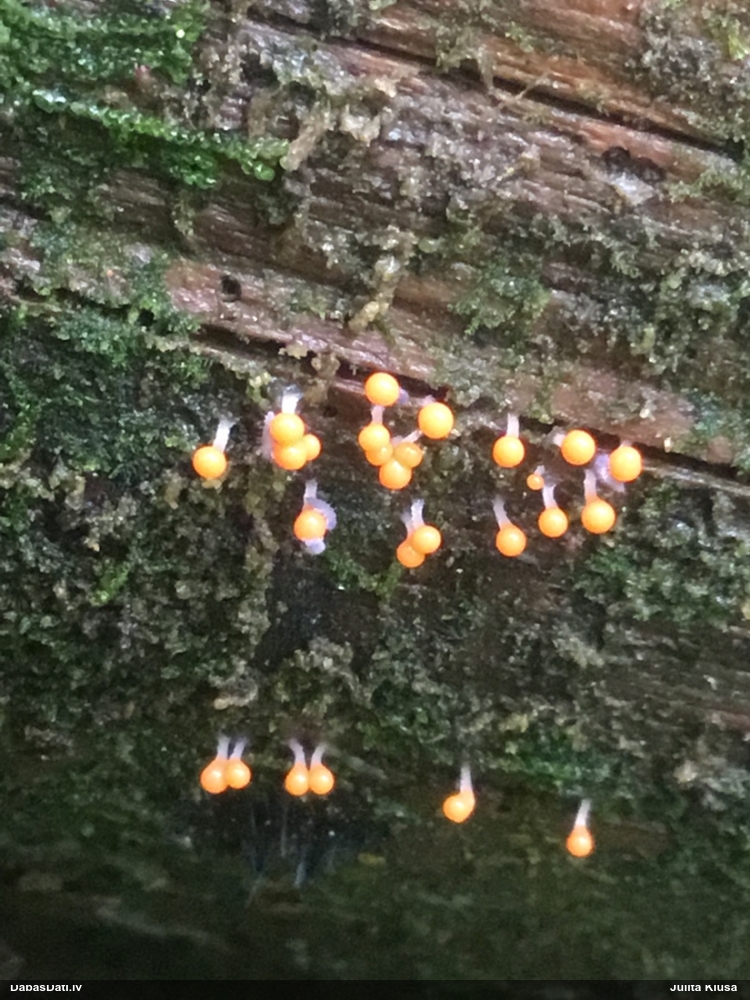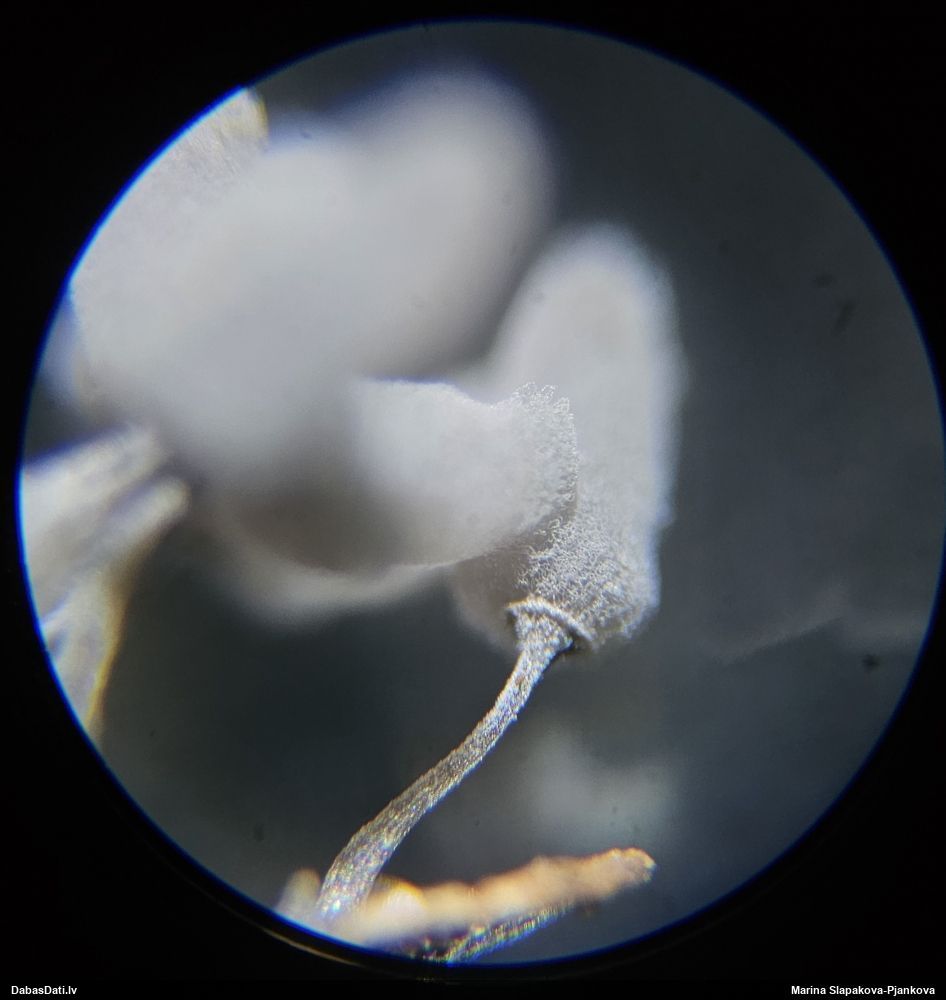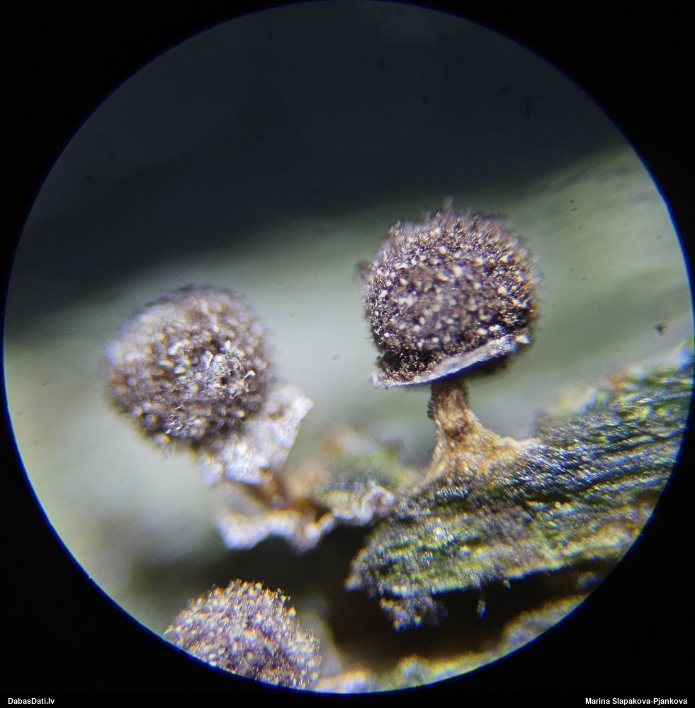 Paldies, Raivo! Ar acu gaišumu man arvien sliktāk, bet mikroskops palīdz. Jā, gribēju teikt, ka paraugam, ja vien nav kāda jutīga atradne, kurai drīkst ievākt tikai mazu gabaliņu, vērts ievākt lielāku gabalu, jo gļotsēnēm patīk kompānija. Un mikroskopa mazajos palielinājumos ar sānu papildus apgaismojumu ir vērts rūpīgi "izstaigāt" visu paraugu. Arī ķērpjus un interesantas sīksēnītes tā var atrast, ko dabā nepamanītu. Ar kriksītēm ir dažādi - pirmās es tā arī tikai citu sugu paraugos pamanīju, bet vēlāk redzēju arī dabā kriskīšu plantācijas - ja to ir daudz, tad var pamanīt jau dabā. Uz sūnām gan ir ekstrēms gadījums, dabā droši nepamanītu, arī eksemplāra noņemšana no sūnas nebija pārāk veiksmīga, tāpēc par noteikšanu mazliet šaubos (sporām mazliet cits tonis). Bet pagaidām citas hipotēzes nav (un konkrētā eksemplāra arī vairs ne).