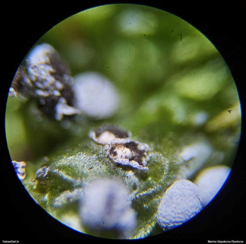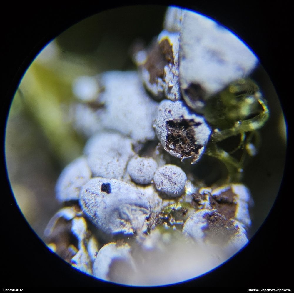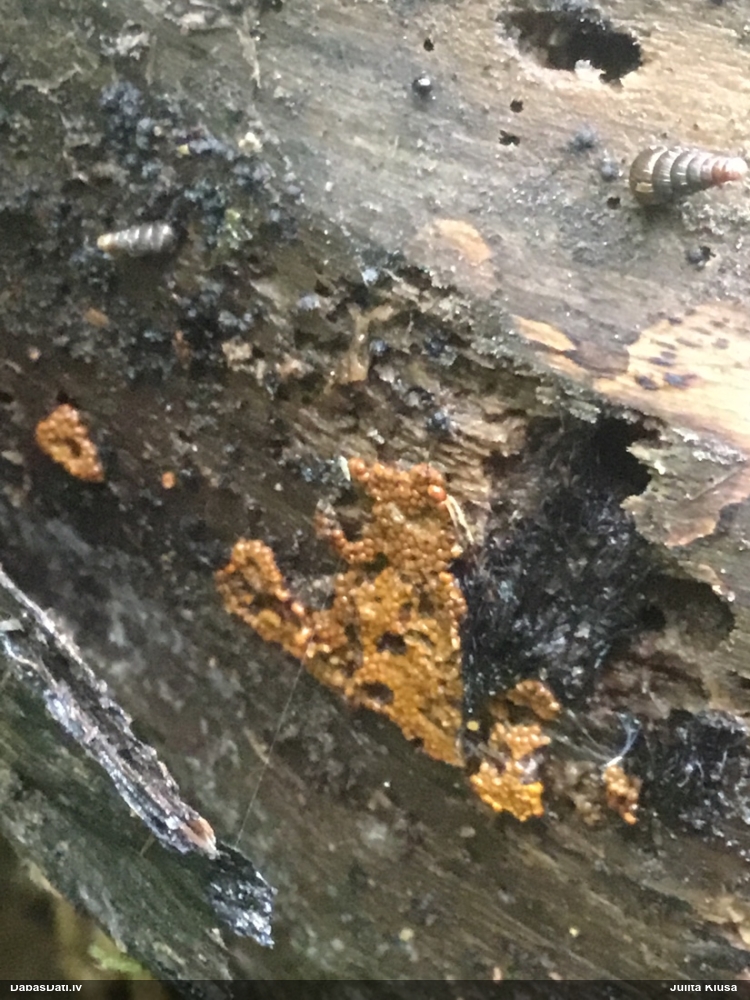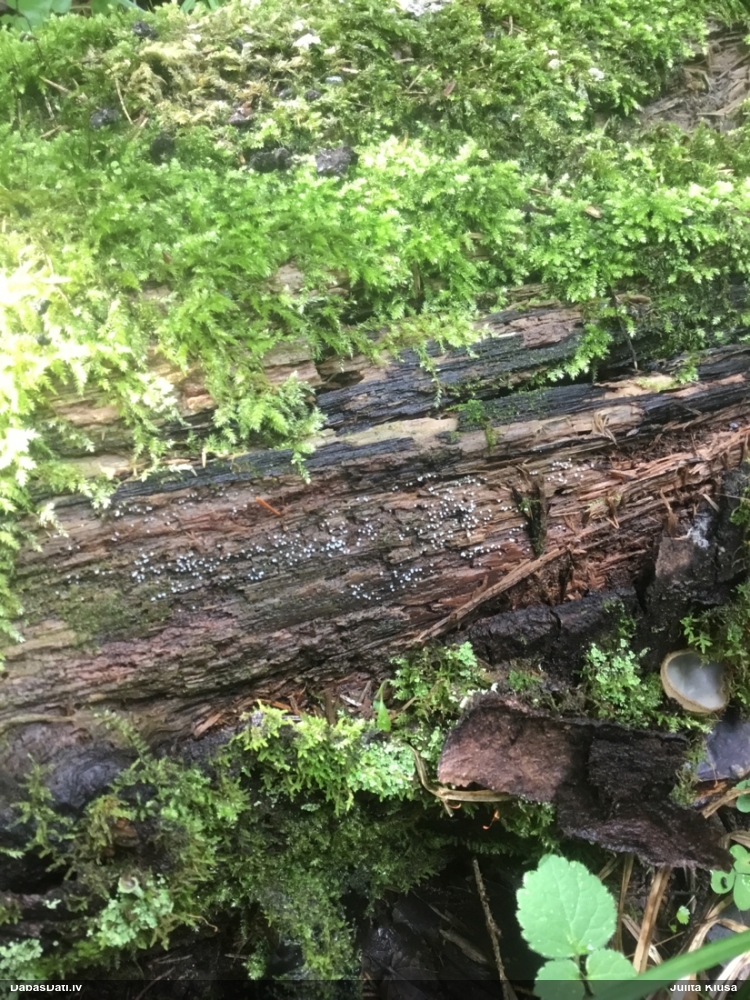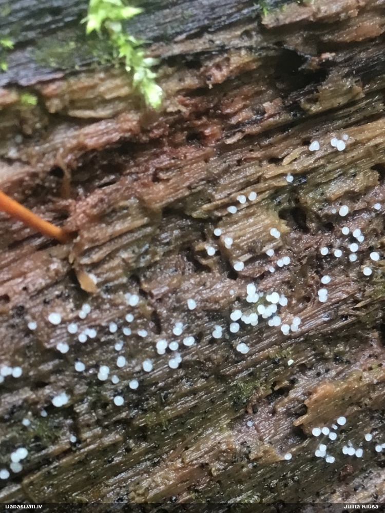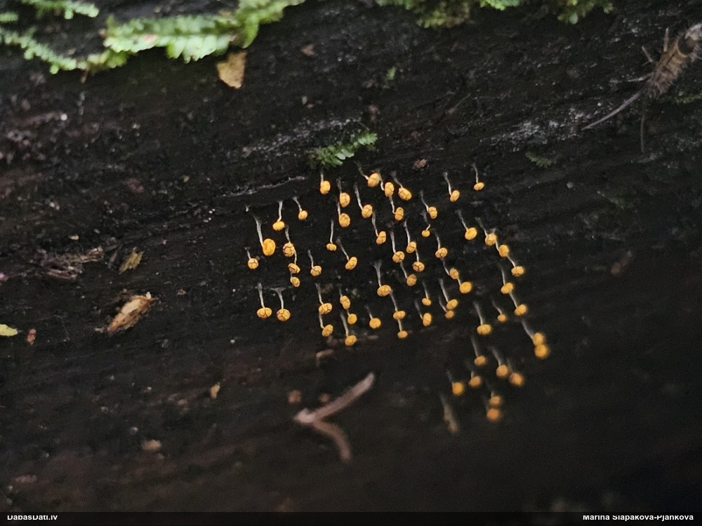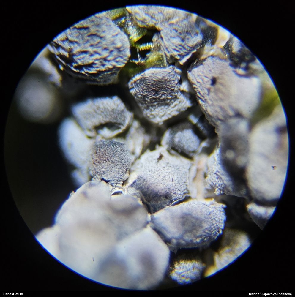 Paldies, Raivo! Ar acu gaišumu man arvien sliktāk, bet mikroskops palīdz. Jā, gribēju teikt, ka paraugam, ja vien nav kāda jutīga atradne, kurai drīkst ievākt tikai mazu gabaliņu, vērts ievākt lielāku gabalu, jo gļotsēnēm patīk kompānija. Un mikroskopa mazajos palielinājumos ar sānu papildus apgaismojumu ir vērts rūpīgi "izstaigāt" visu paraugu. Arī ķērpjus un interesantas sīksēnītes tā var atrast, ko dabā nepamanītu. Ar kriksītēm ir dažādi - pirmās es tā arī tikai citu sugu paraugos pamanīju, bet vēlāk redzēju arī dabā kriskīšu plantācijas - ja to ir daudz, tad var pamanīt jau dabā. Uz sūnām gan ir ekstrēms gadījums, dabā droši nepamanītu, arī eksemplāra noņemšana no sūnas nebija pārāk veiksmīga, tāpēc par noteikšanu mazliet šaubos (sporām mazliet cits tonis). Bet pagaidām citas hipotēzes nav (un konkrētā eksemplāra arī vairs ne).