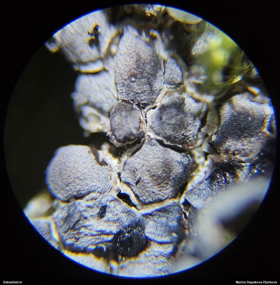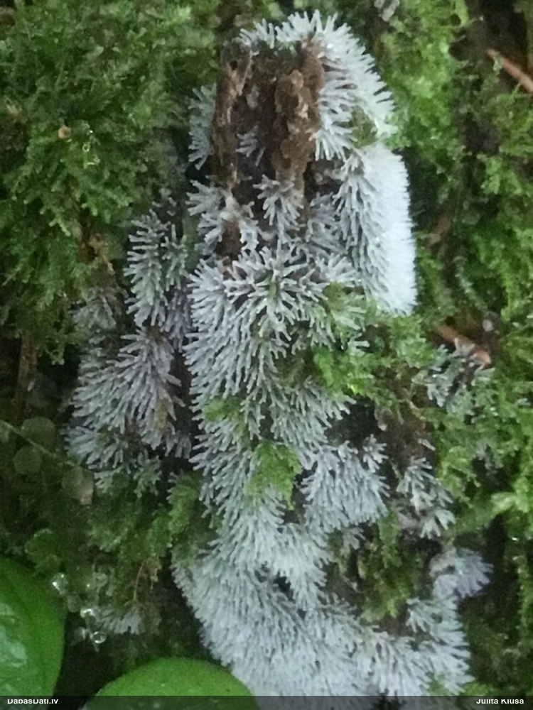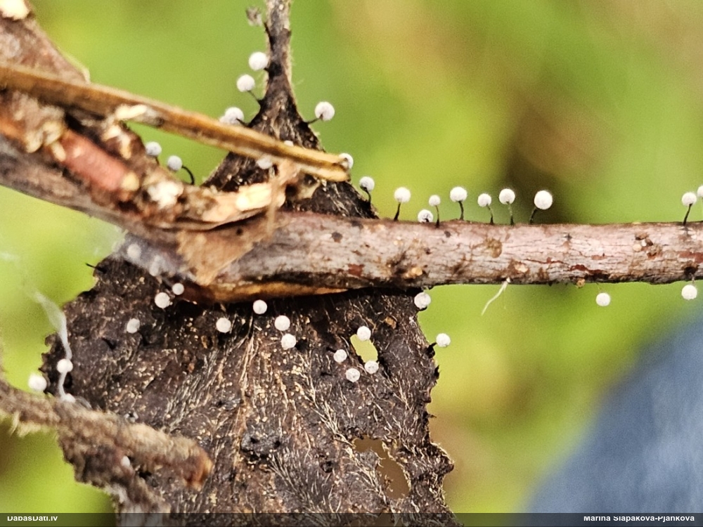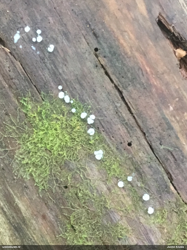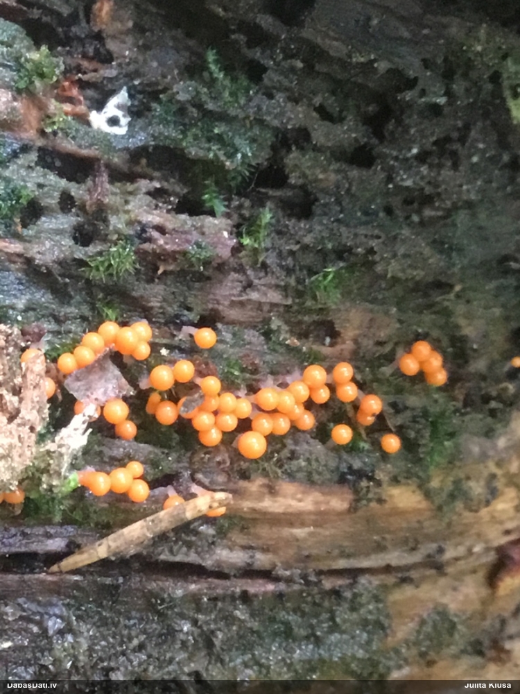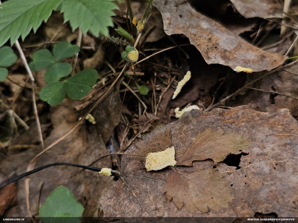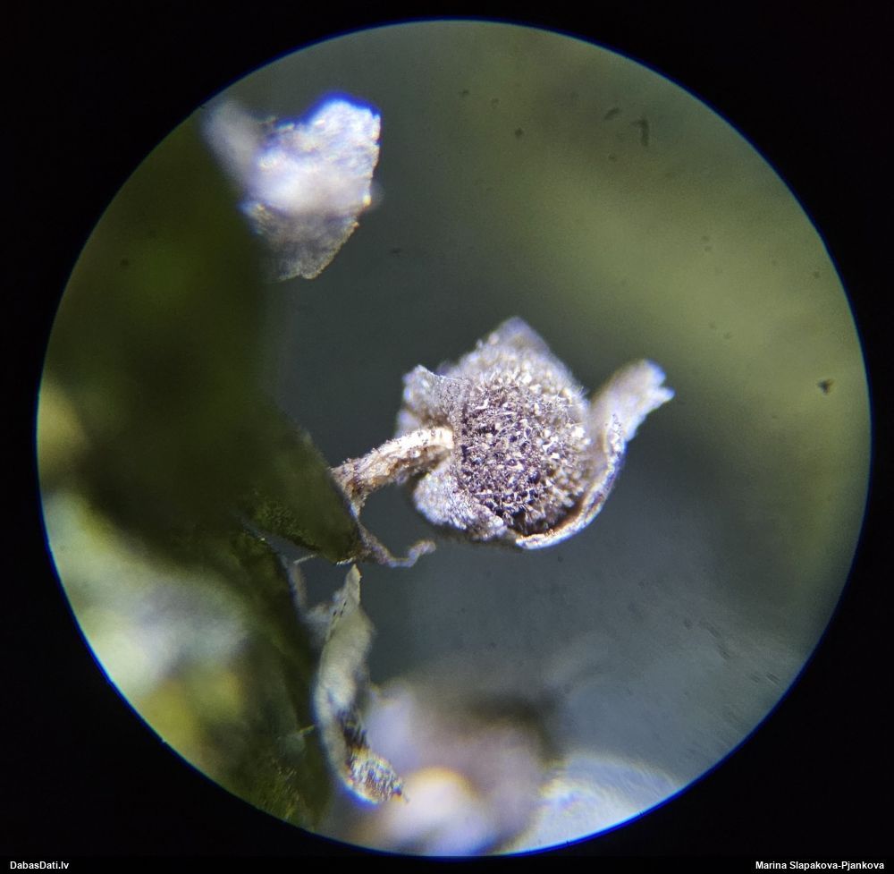 Paldies, Raivo! Ar acu gaišumu man arvien sliktāk, bet mikroskops palīdz. Jā, gribēju teikt, ka paraugam, ja vien nav kāda jutīga atradne, kurai drīkst ievākt tikai mazu gabaliņu, vērts ievākt lielāku gabalu, jo gļotsēnēm patīk kompānija. Un mikroskopa mazajos palielinājumos ar sānu papildus apgaismojumu ir vērts rūpīgi "izstaigāt" visu paraugu. Arī ķērpjus un interesantas sīksēnītes tā var atrast, ko dabā nepamanītu. Ar kriksītēm ir dažādi - pirmās es tā arī tikai citu sugu paraugos pamanīju, bet vēlāk redzēju arī dabā kriskīšu plantācijas - ja to ir daudz, tad var pamanīt jau dabā. Uz sūnām gan ir ekstrēms gadījums, dabā droši nepamanītu, arī eksemplāra noņemšana no sūnas nebija pārāk veiksmīga, tāpēc par noteikšanu mazliet šaubos (sporām mazliet cits tonis). Bet pagaidām citas hipotēzes nav (un konkrētā eksemplāra arī vairs ne).
