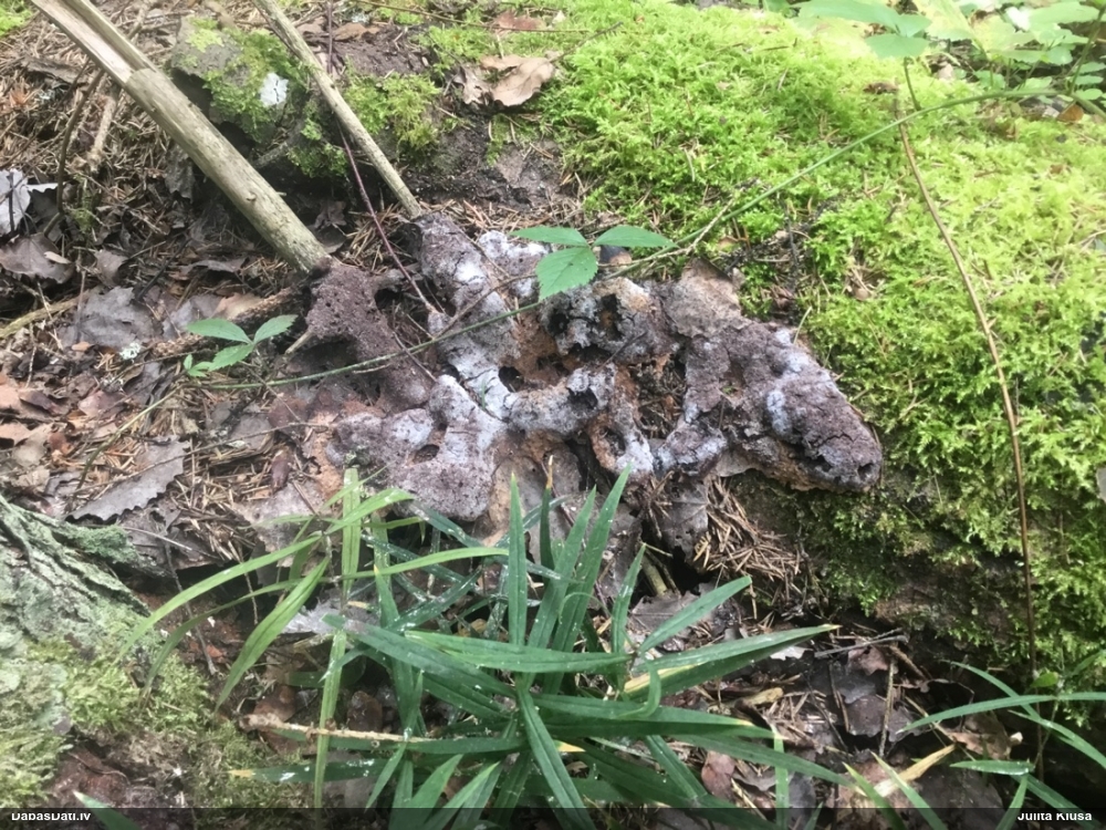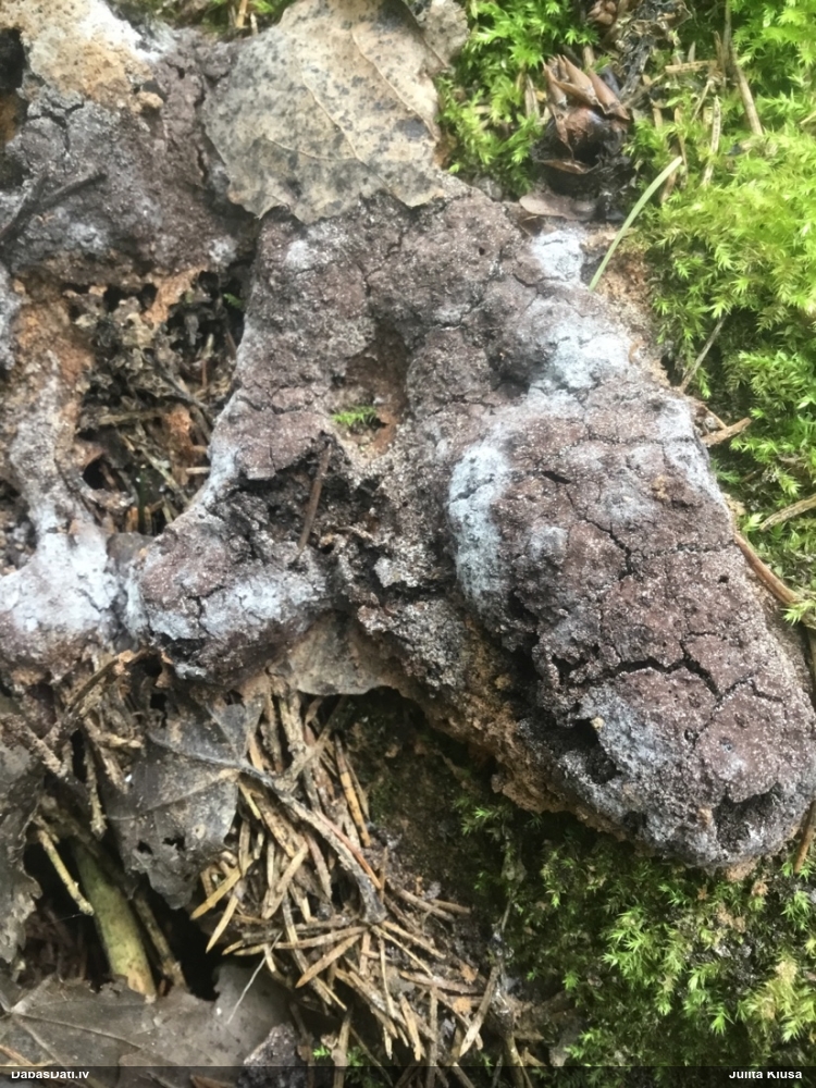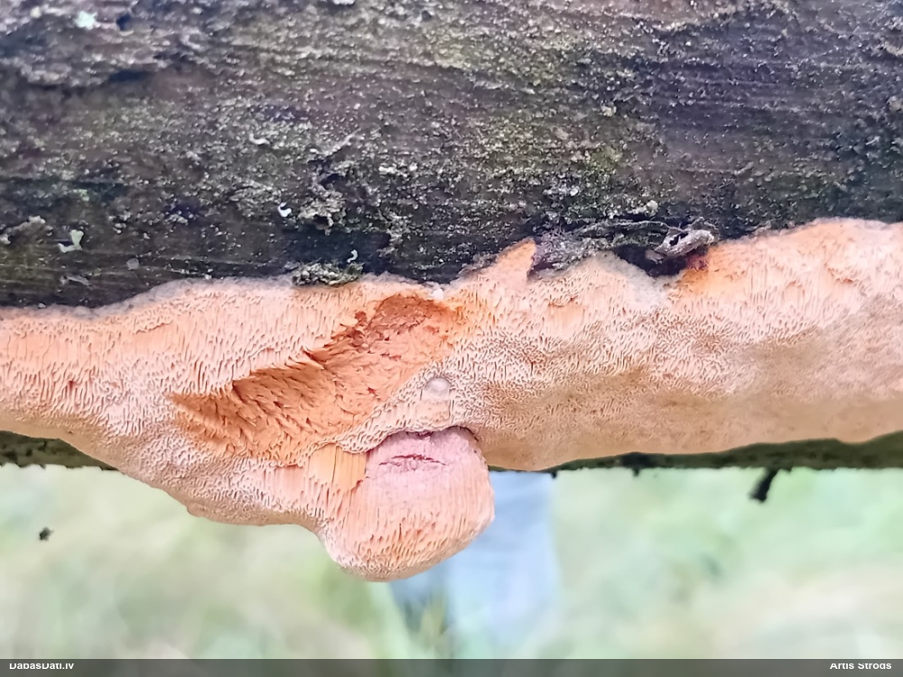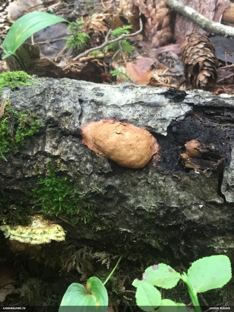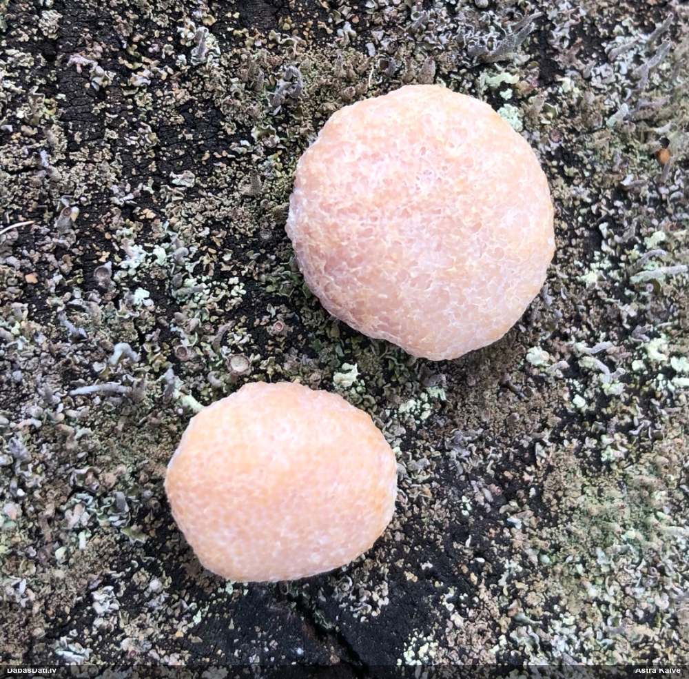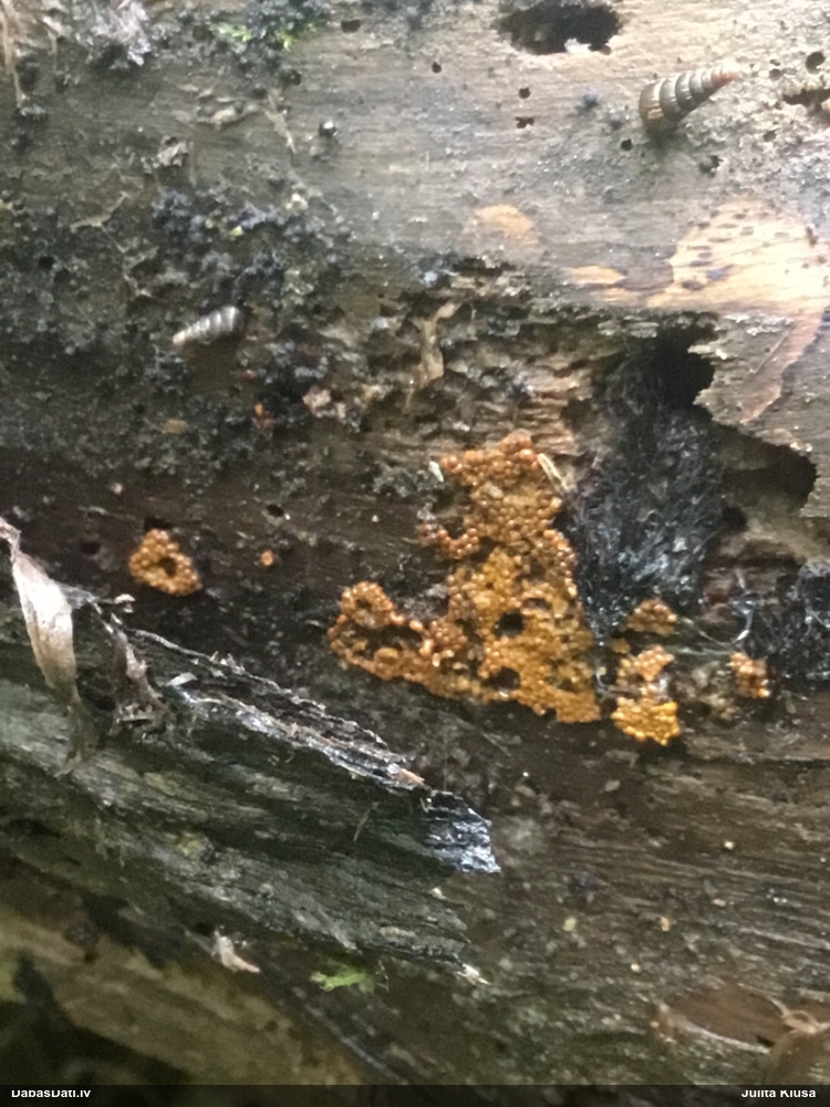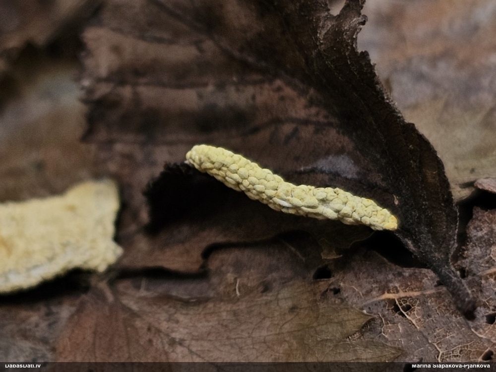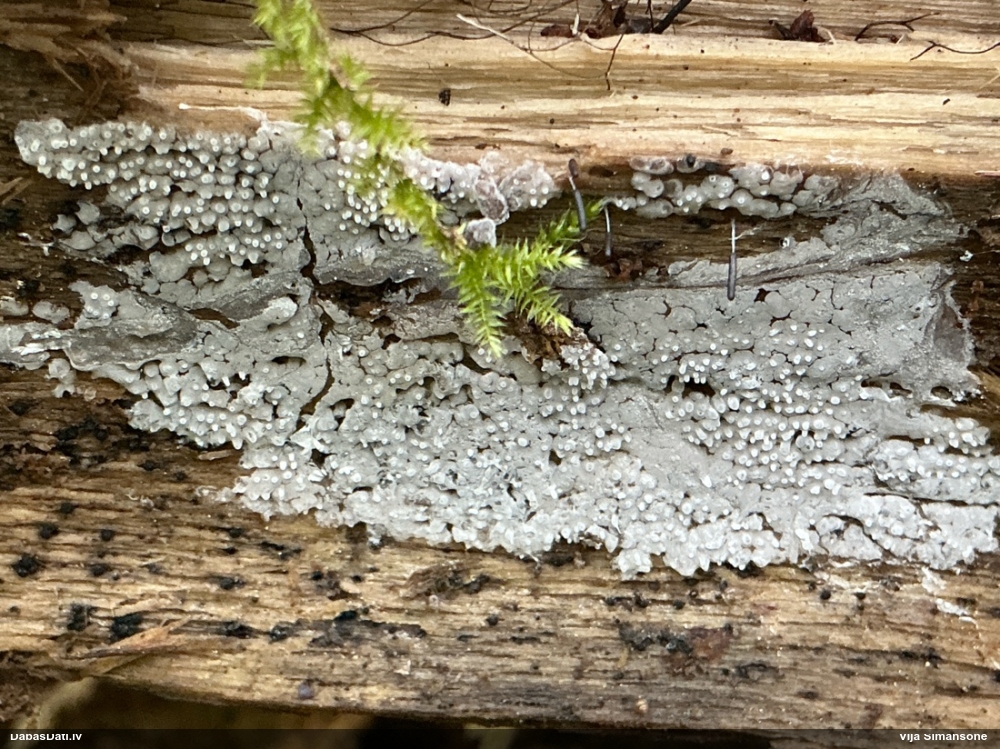 Paldies par paraugu! Paraugā augļķermeņi gan bija ļoti cieti, līdz galam nenobrieduši. Jauna eksemplāra krāsa var būt nozīmīga noteikšanā, bet svarīgi arī nobriedināt (turot mitrākā vietā), citādi perīdiju noņemt mikroskopēšanai ir praktiski neiespējami. Šajā gadījumā mazu gabaliņu izdevās atmiekšķēt un nodabūt, kas sarežģītākos gadījumos varētu būt nepietiekami. Pēc izmēra un perīdija pazīmēm te varētu būt divi varianti L.irregularis un L.epidendrum, kas esot viens no grūtāk atšķiramajiem sugu pāriem. L.epidendrum vairāk raksturīgi, kā es tos saucu, pārstaipi uz augļķermeņa virsmas, kas te ir ļoti labi redzami, tāpēc izšķīros par parastāko sugu.