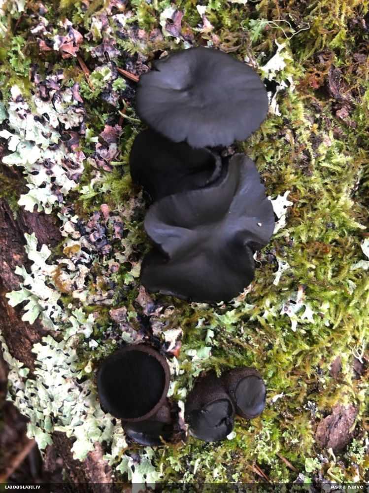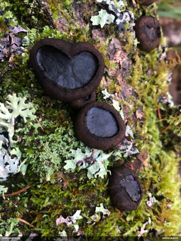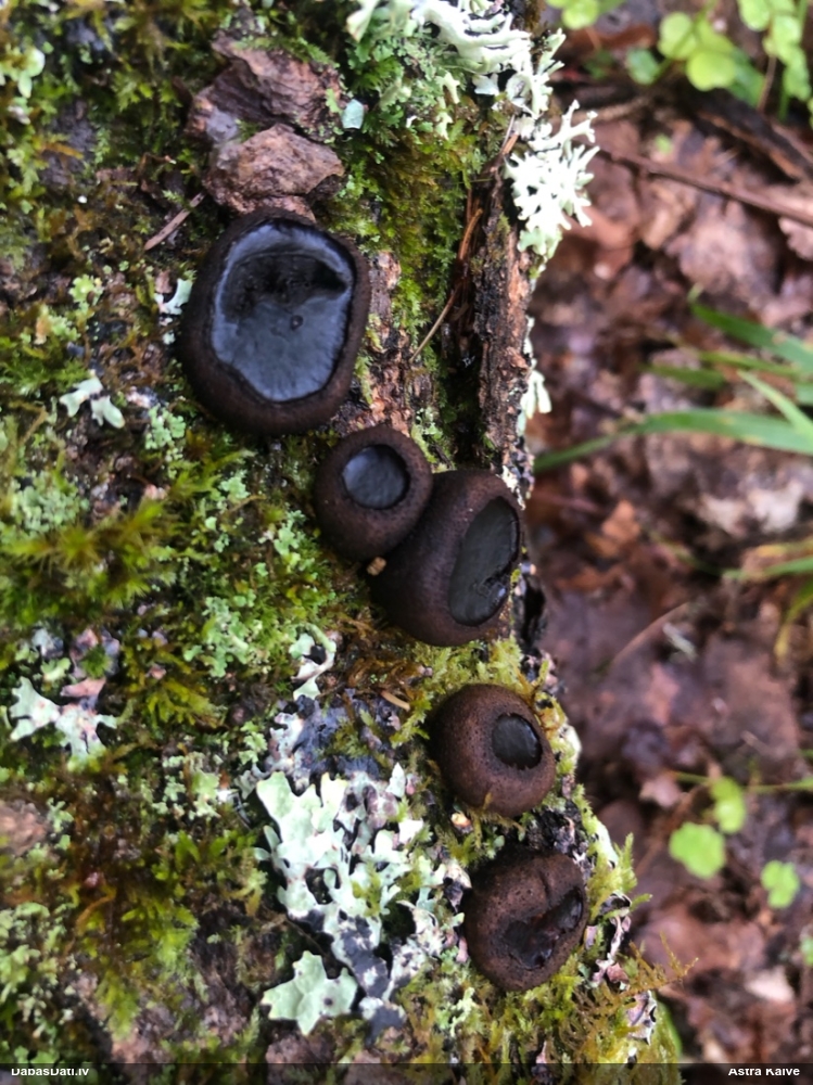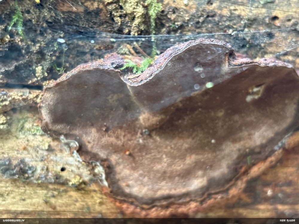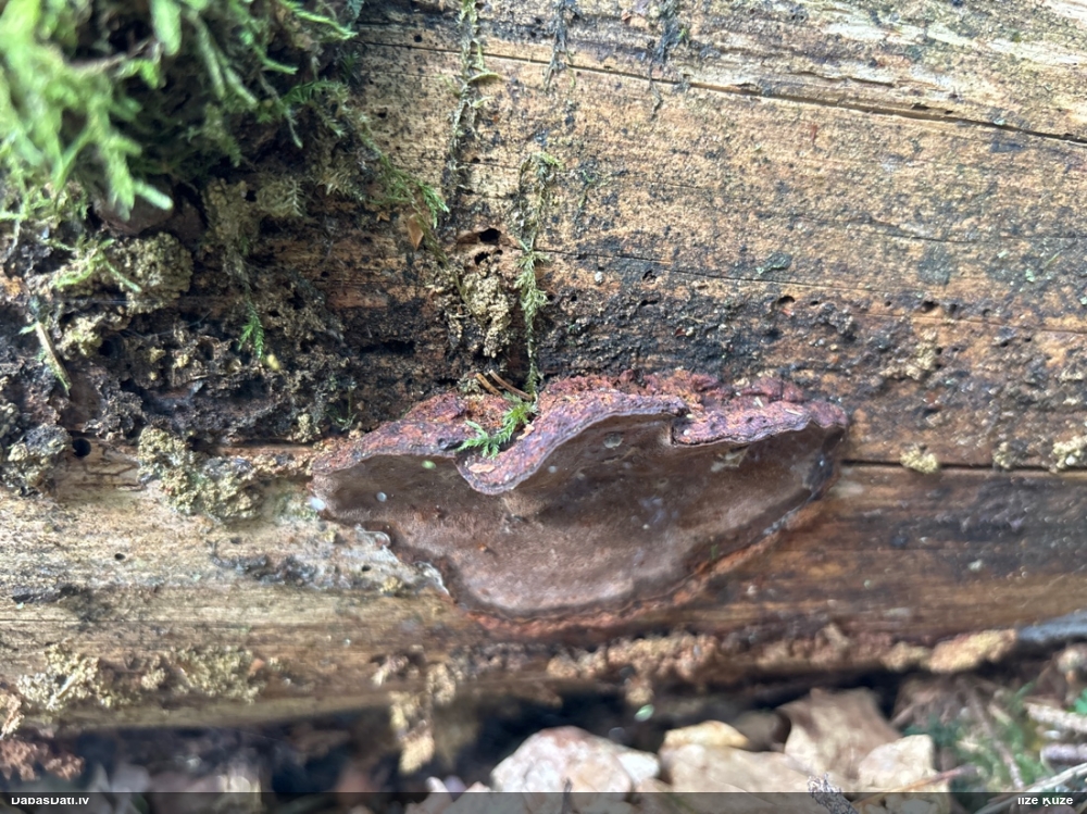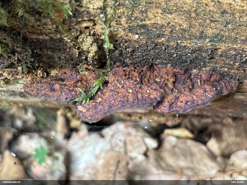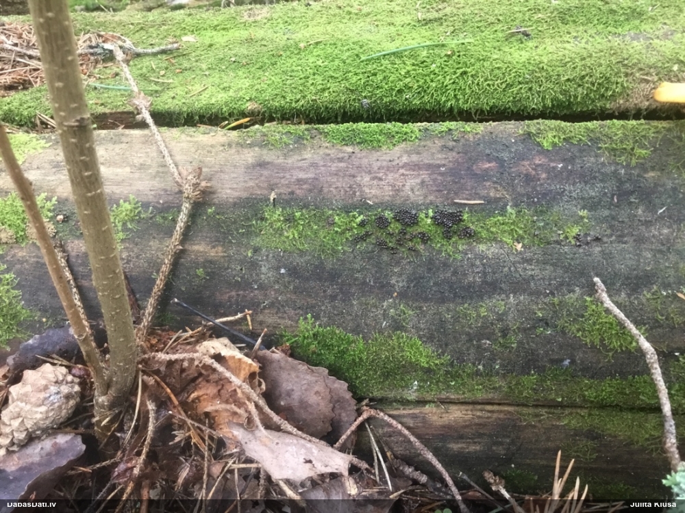Šis interesants. Uz sausām priedes kritalām rozā mazi līdzīga izskata augļķermeņi maijā aug divām citādi atšķirīgām sugām (dažādās dzimtās) - melnajai plaispikai Amaurochaete atra un trauslajam gļotpūpēdim Reticularia jurana. Pēc sīkām mikropazīmēm (foto nav redzama pat ne sīka balta pakāje ap augļķermeni, un uz virsmas ar lielu piepūli var ja ne saskatīt, tad iztēloties tīklotu virsmas rakstu) izšķīros par biežāko no abām - melno plaispiku, kas tipiski aug samērā atklātās, skrajās vietās, t.sk. nesenos izcirtumos.