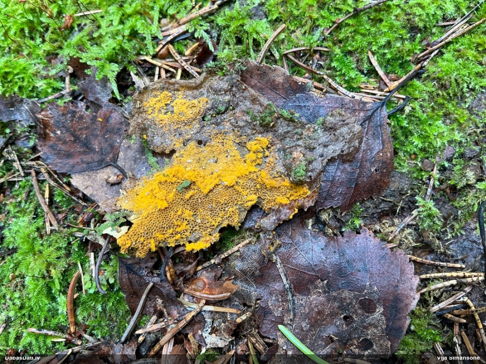 No foto īsti nevar saprast - sporas tiešām pēc gļotsēņu sporām izskatījās? Ja sēne, kāpēc tikai vienu sugu izskatīt? Svarīgākais vispirms saprast, vai sporu izskats ir gļotsēnīgs vai sēnīgs. Tiešām ir tīkliņš? Es ar savu redzi varu arī neredzēt, bet nu saskatīt no raksta es nevaru vispār neko. Avenes man īsti arī neatgādina. Nelasot diskusiju, izdomāju, ka jābūt sēnei. Kā saka - atbilde slēpjas iekšās :). Ja gļotsēne - kāds ir kapilīcijs?