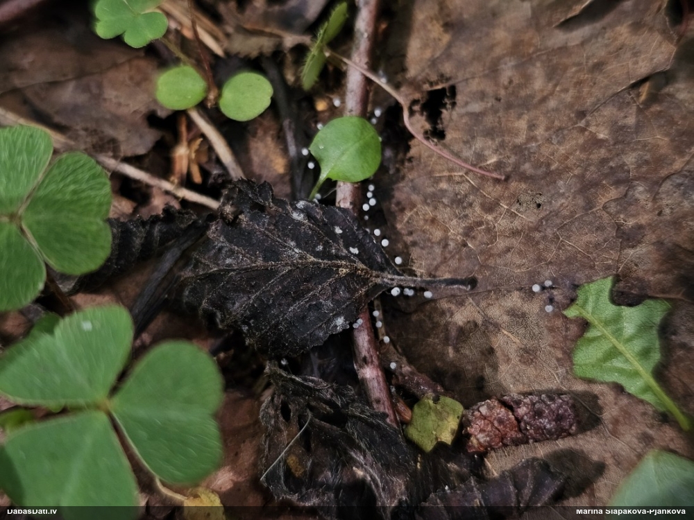 Gļotsēņu atslēga man piedāvāja konkrētu sugu - Physarum leucophaeum (ņēmu vērā arī lapkoku klātbūtni). Ar pārsteigumu konstatēju, ka arī kopskats sugai ļoti labi atbilst. Lai arī šīs no mikroskopējamām, un it kā kkas līdzīgs var būt "viss kas", baigi jau velk uz to, ka atslēgai taisnība, jo citām līdzīgajām pilnais komplekts arī manā galvas datubāzē, ne tikai atslēgā, īsti neatbilst.