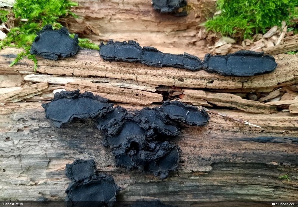 Šobrīd varu iedomāties 2 variantus - melnā plaispika Amaurochaete atra vai parastais gļotpūpēdis Reticularia lycoperdon. Pēc izmēra, augšanas laika un augšanas uz apstrādāta koka atbilst abas.