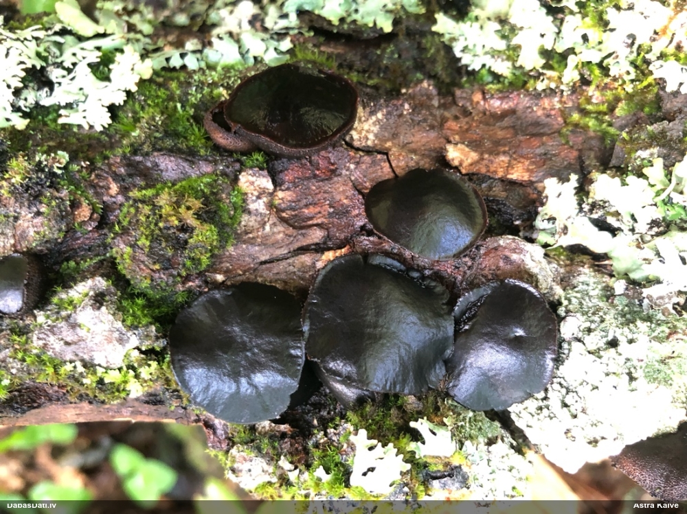 Šis interesants. Uz sausām priedes kritalām rozā mazi līdzīga izskata augļķermeņi maijā aug divām citādi atšķirīgām sugām (dažādās dzimtās) - melnajai plaispikai Amaurochaete atra un trauslajam gļotpūpēdim Reticularia jurana. Pēc sīkām mikropazīmēm (foto nav redzama pat ne sīka balta pakāje ap augļķermeni, un uz virsmas ar lielu piepūli var ja ne saskatīt, tad iztēloties tīklotu virsmas rakstu) izšķīros par biežāko no abām - melno plaispiku, kas tipiski aug samērā atklātās, skrajās vietās, t.sk. nesenos izcirtumos.