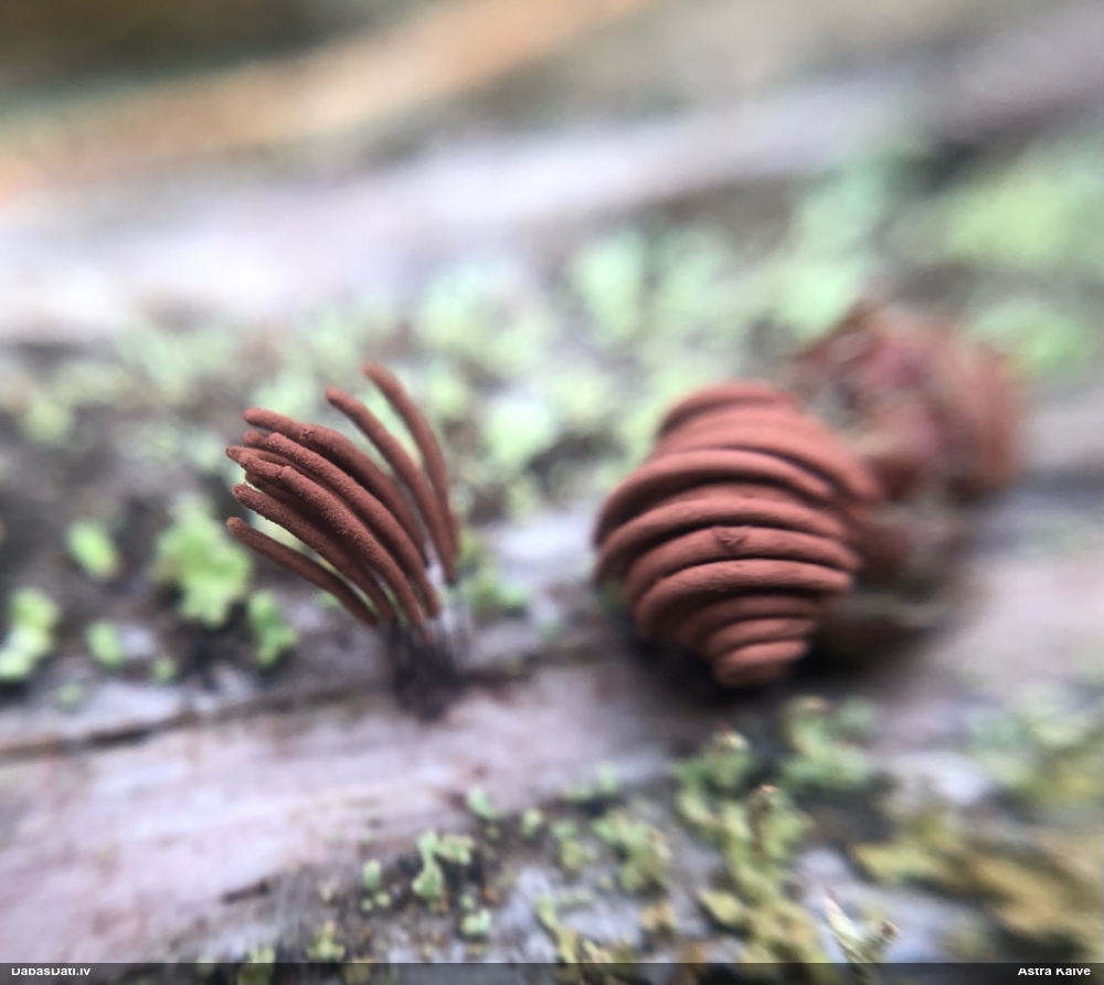 Šis interesants. Uz sausām priedes kritalām rozā mazi līdzīga izskata augļķermeņi maijā aug divām citādi atšķirīgām sugām (dažādās dzimtās) - melnajai plaispikai Amaurochaete atra un trauslajam gļotpūpēdim Reticularia jurana. Pēc sīkām mikropazīmēm (foto nav redzama pat ne sīka balta pakāje ap augļķermeni, un uz virsmas ar lielu piepūli var ja ne saskatīt, tad iztēloties tīklotu virsmas rakstu) izšķīros par biežāko no abām - melno plaispiku, kas tipiski aug samērā atklātās, skrajās vietās, t.sk. nesenos izcirtumos.