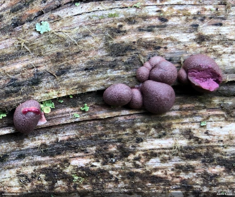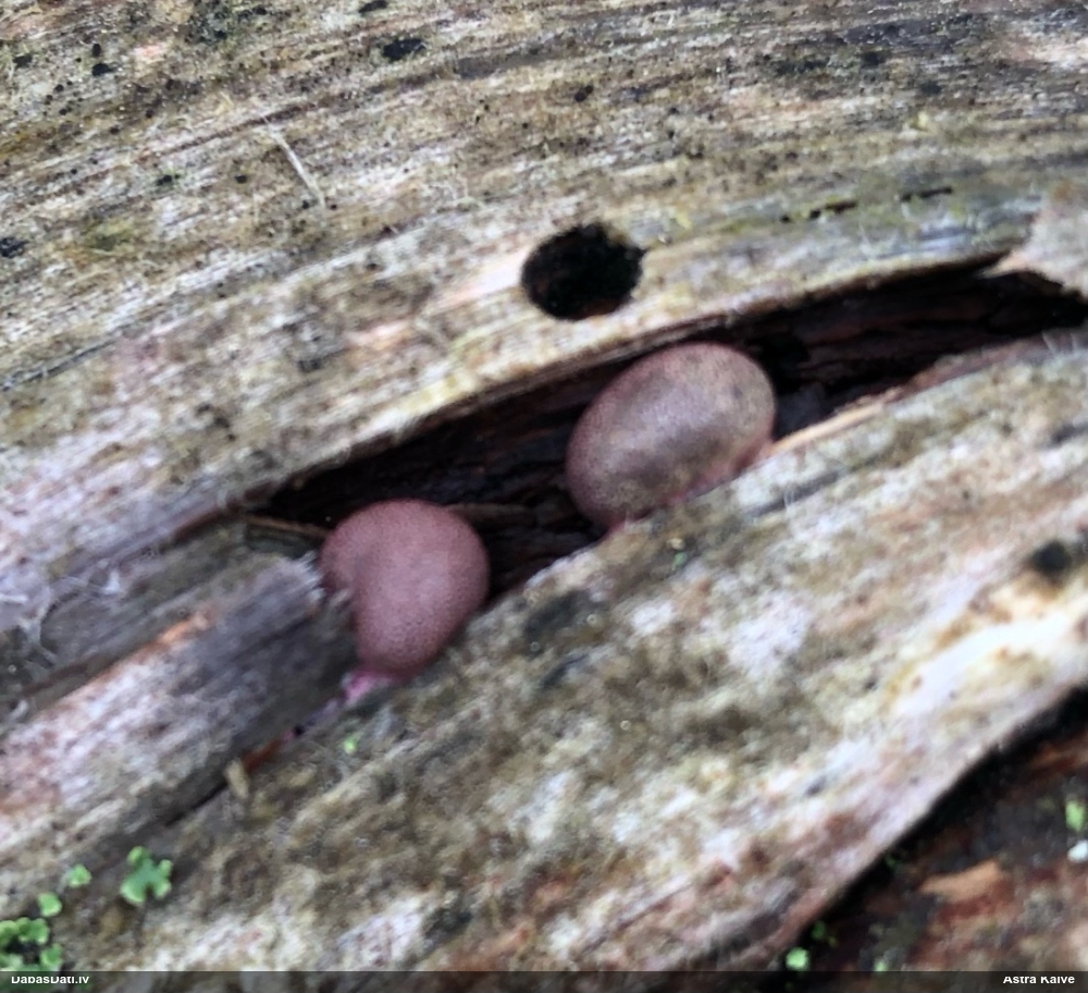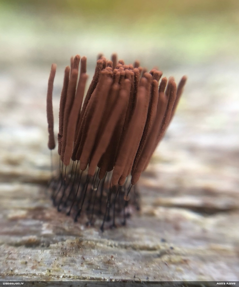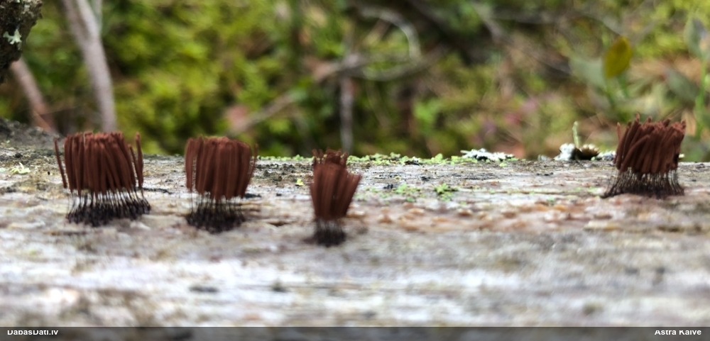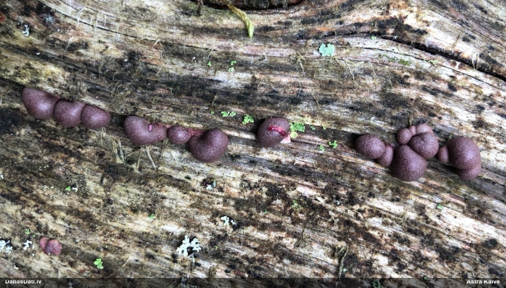 Šis interesants. Uz sausām priedes kritalām rozā mazi līdzīga izskata augļķermeņi maijā aug divām citādi atšķirīgām sugām (dažādās dzimtās) - melnajai plaispikai Amaurochaete atra un trauslajam gļotpūpēdim Reticularia jurana. Pēc sīkām mikropazīmēm (foto nav redzama pat ne sīka balta pakāje ap augļķermeni, un uz virsmas ar lielu piepūli var ja ne saskatīt, tad iztēloties tīklotu virsmas rakstu) izšķīros par biežāko no abām - melno plaispiku, kas tipiski aug samērā atklātās, skrajās vietās, t.sk. nesenos izcirtumos.
