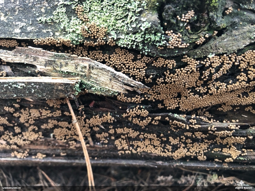 Šobrīd varu iedomāties 2 variantus - melnā plaispika Amaurochaete atra vai parastais gļotpūpēdis Reticularia lycoperdon. Pēc izmēra, augšanas laika un augšanas uz apstrādāta koka atbilst abas.