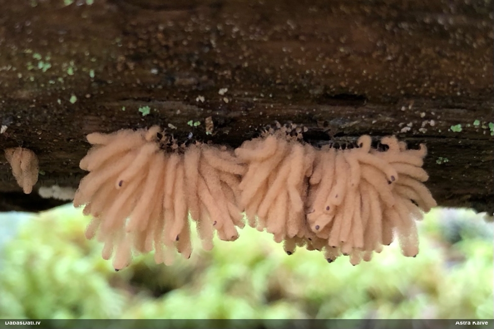 No foto īsti nevar saprast - sporas tiešām pēc gļotsēņu sporām izskatījās? Ja sēne, kāpēc tikai vienu sugu izskatīt? Svarīgākais vispirms saprast, vai sporu izskats ir gļotsēnīgs vai sēnīgs. Tiešām ir tīkliņš? Es ar savu redzi varu arī neredzēt, bet nu saskatīt no raksta es nevaru vispār neko. Avenes man īsti arī neatgādina. Nelasot diskusiju, izdomāju, ka jābūt sēnei. Kā saka - atbilde slēpjas iekšās :). Ja gļotsēne - kāds ir kapilīcijs?