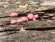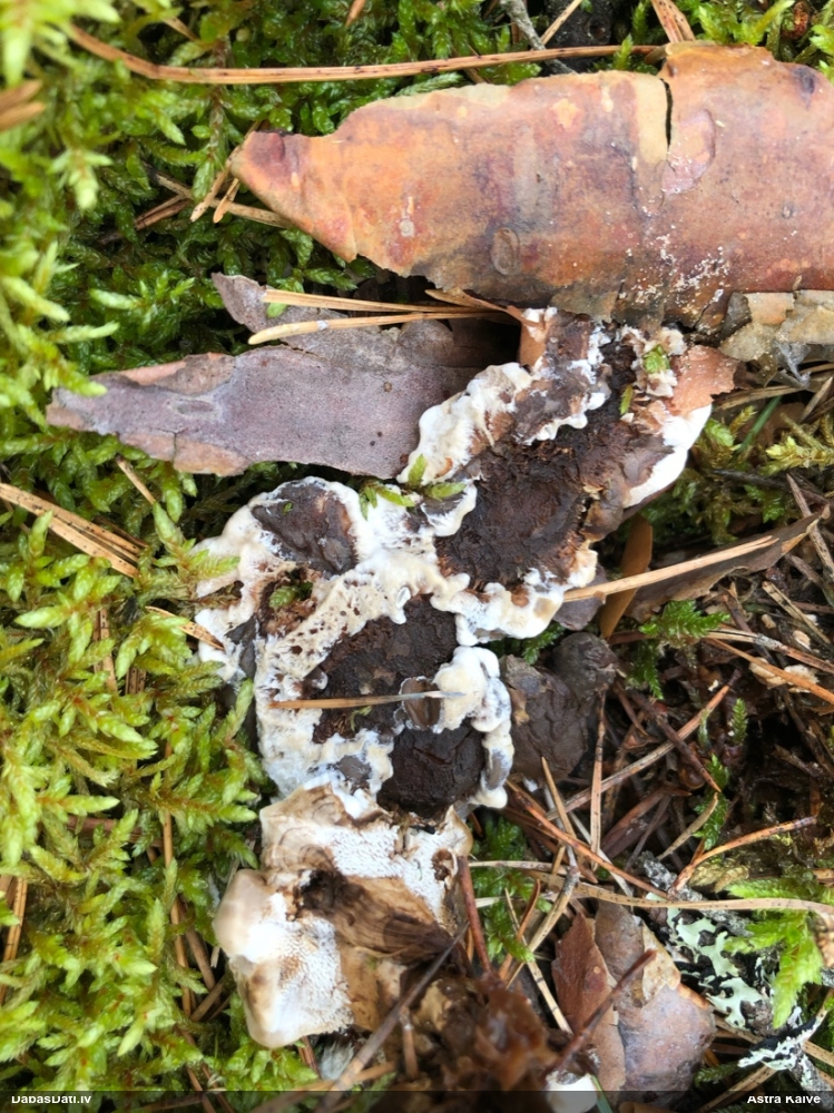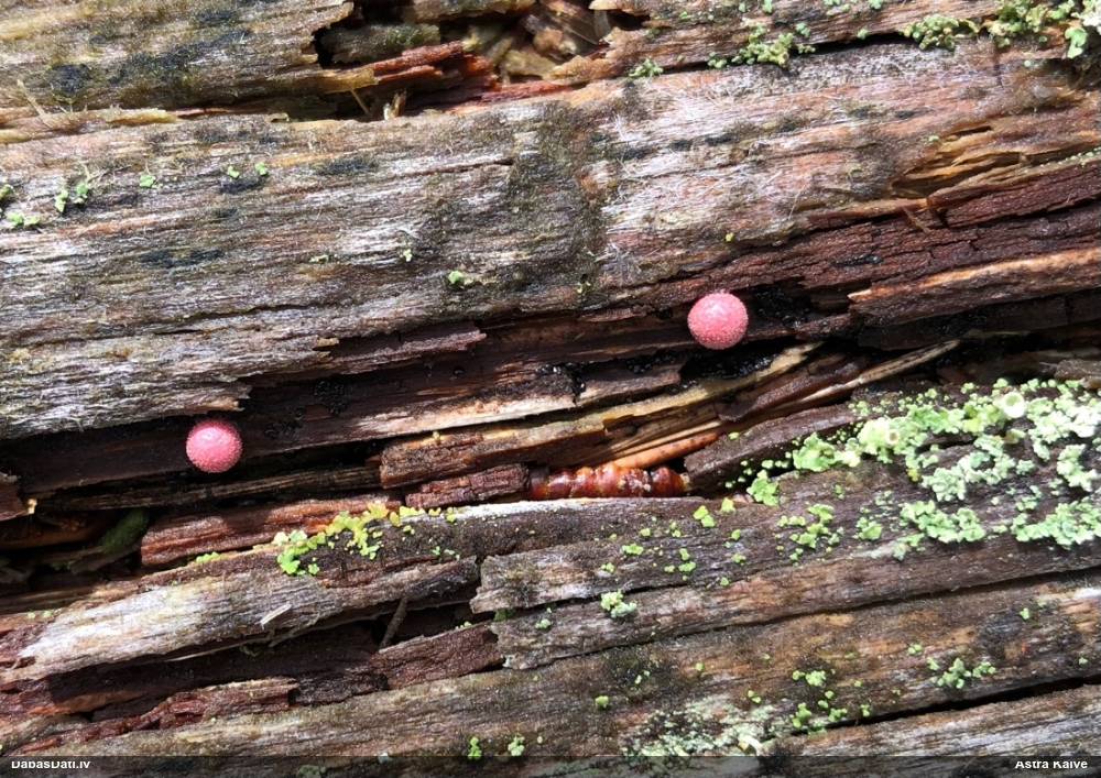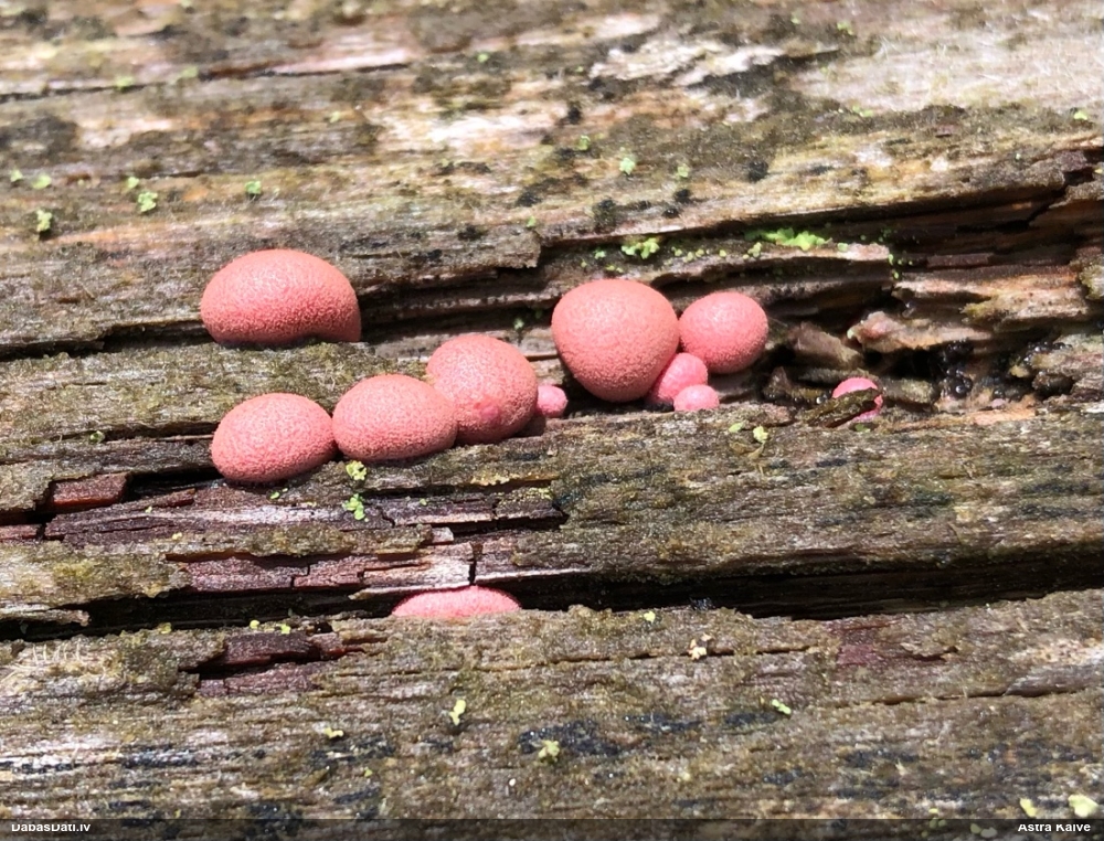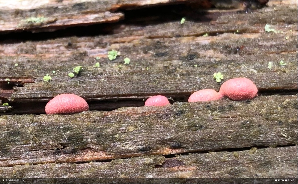 Šis interesants. Uz sausām priedes kritalām rozā mazi līdzīga izskata augļķermeņi maijā aug divām citādi atšķirīgām sugām (dažādās dzimtās) - melnajai plaispikai Amaurochaete atra un trauslajam gļotpūpēdim Reticularia jurana. Pēc sīkām mikropazīmēm (foto nav redzama pat ne sīka balta pakāje ap augļķermeni, un uz virsmas ar lielu piepūli var ja ne saskatīt, tad iztēloties tīklotu virsmas rakstu) izšķīros par biežāko no abām - melno plaispiku, kas tipiski aug samērā atklātās, skrajās vietās, t.sk. nesenos izcirtumos.