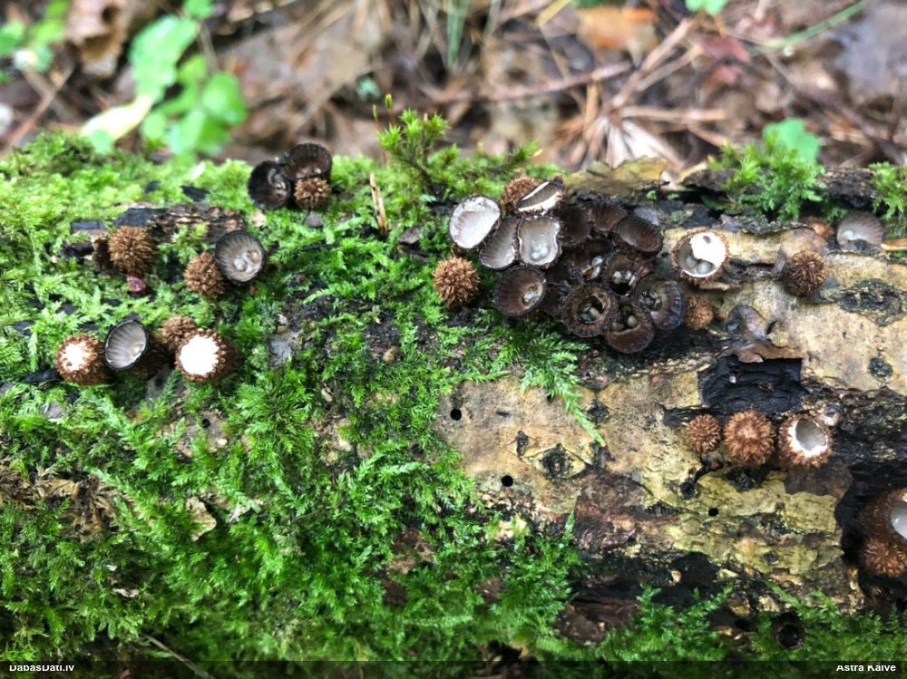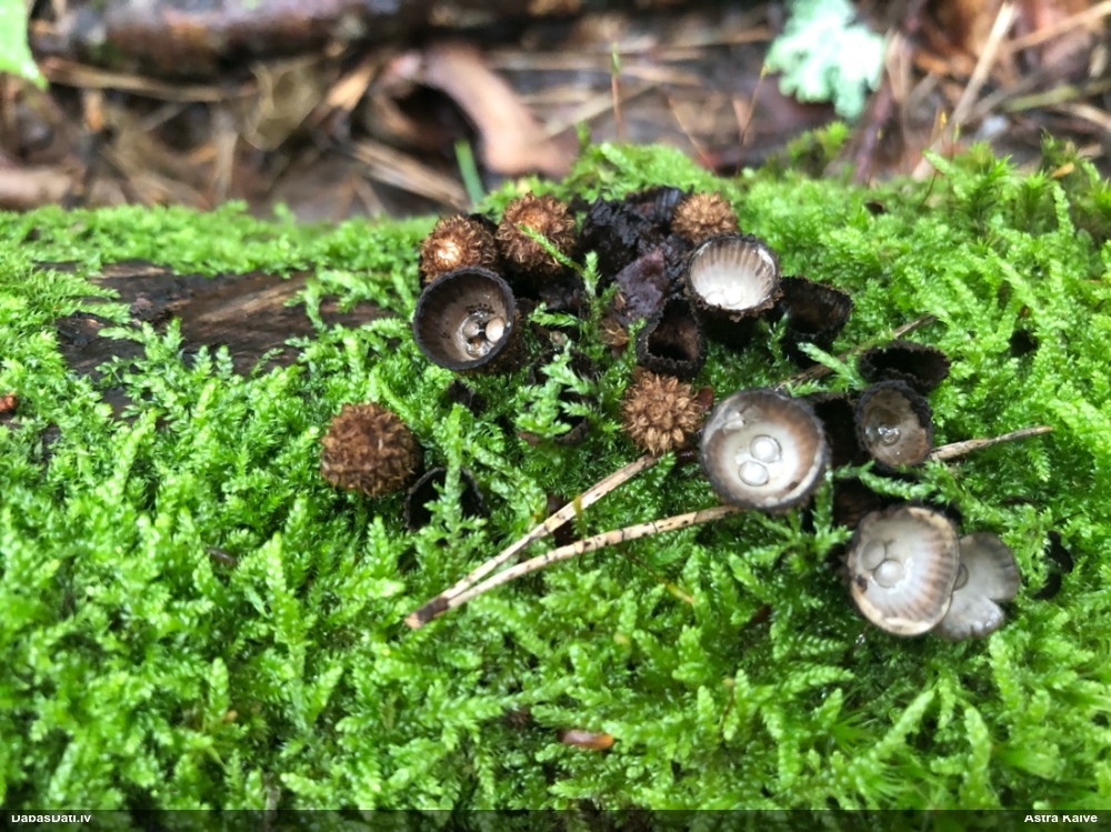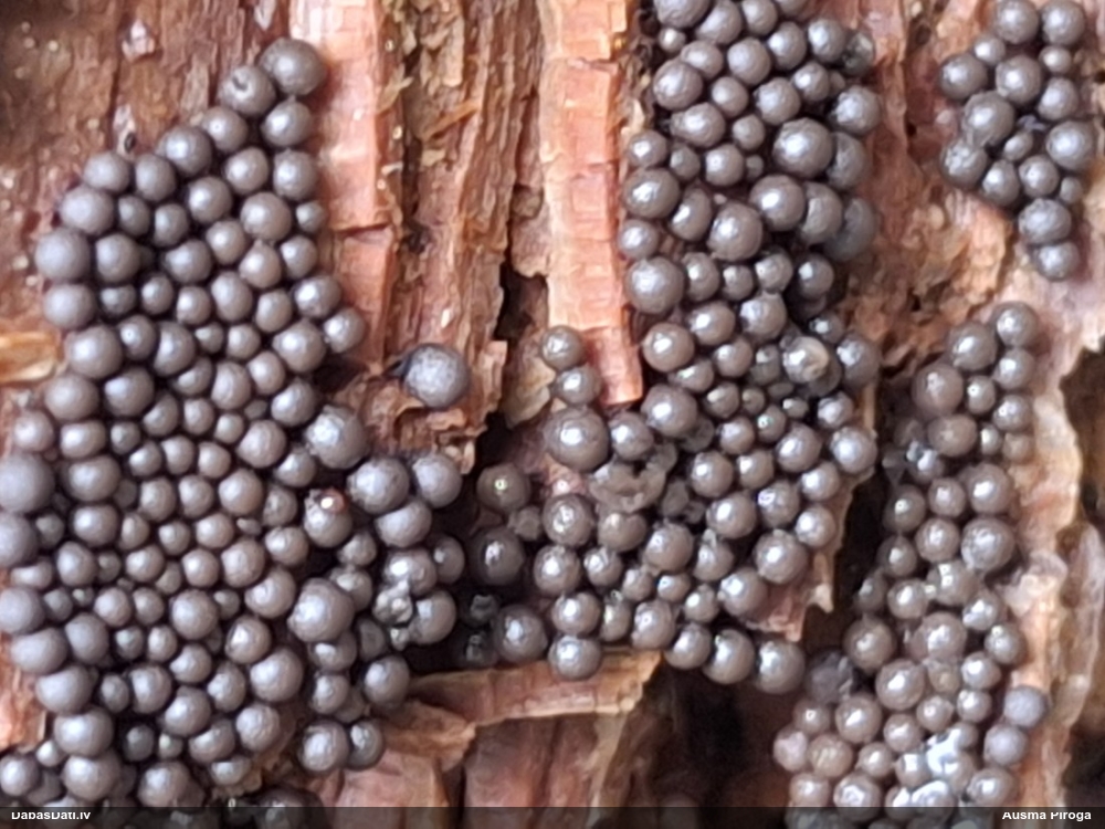 Šis interesants. Uz sausām priedes kritalām rozā mazi līdzīga izskata augļķermeņi maijā aug divām citādi atšķirīgām sugām (dažādās dzimtās) - melnajai plaispikai Amaurochaete atra un trauslajam gļotpūpēdim Reticularia jurana. Pēc sīkām mikropazīmēm (foto nav redzama pat ne sīka balta pakāje ap augļķermeni, un uz virsmas ar lielu piepūli var ja ne saskatīt, tad iztēloties tīklotu virsmas rakstu) izšķīros par biežāko no abām - melno plaispiku, kas tipiski aug samērā atklātās, skrajās vietās, t.sk. nesenos izcirtumos.