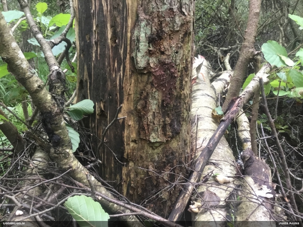 Satrūdējusi kritala mežā, nav dēļi. Iespējams, egle, jauktu koku mežs.