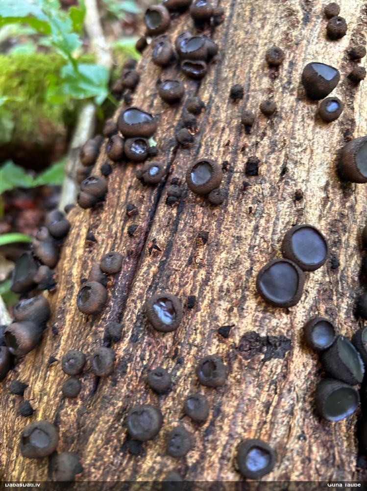 Šobrīd varu iedomāties 2 variantus - melnā plaispika Amaurochaete atra vai parastais gļotpūpēdis Reticularia lycoperdon. Pēc izmēra, augšanas laika un augšanas uz apstrādāta koka atbilst abas.