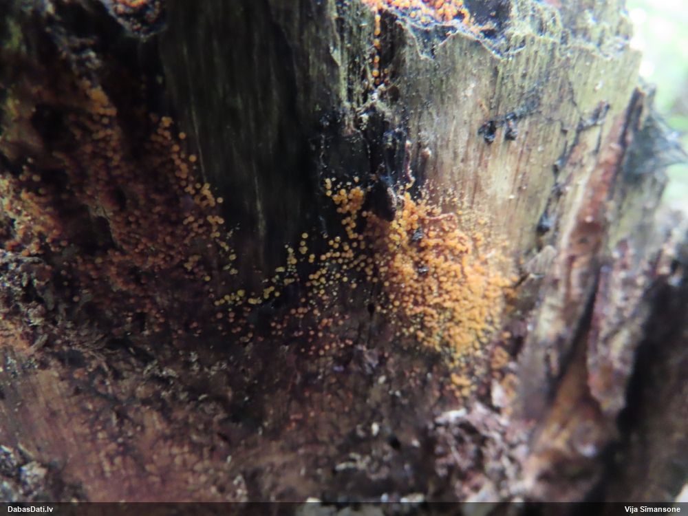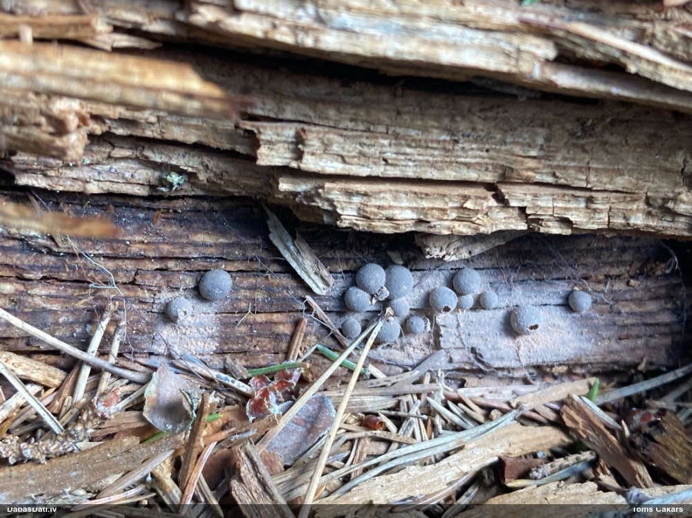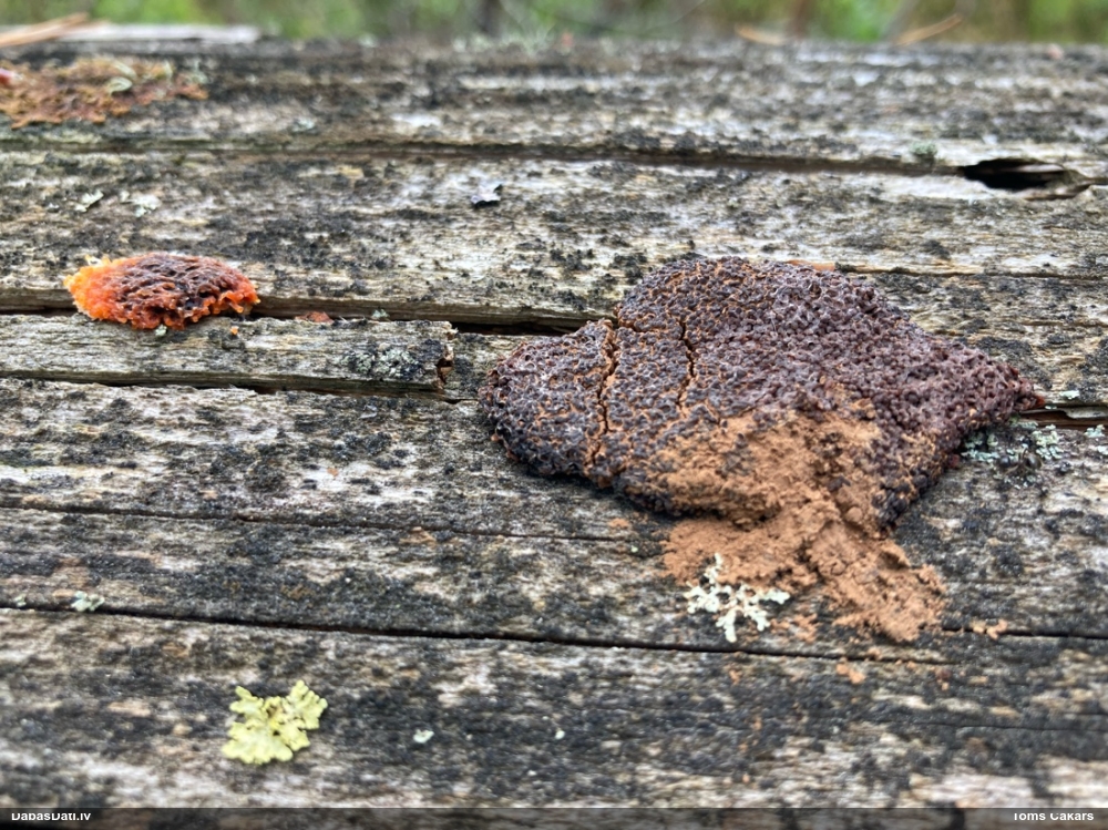 Šobrīd varu iedomāties 2 variantus - melnā plaispika Amaurochaete atra vai parastais gļotpūpēdis Reticularia lycoperdon. Pēc izmēra, augšanas laika un augšanas uz apstrādāta koka atbilst abas.