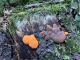 Man pēkšņi radās ideja - vai tur bija nu ļoti mitrs mikroklimats, egle ar melnalksni? Hipotētiski tādas dzeltenas var būt Diachea muscorum. Te bilde ir mazliet līdzīga: https://fr.wikipedia.org/wiki/Fichier:Craterium_muscorum,_Trawscoed,_North_Wales,_Aug_2016_-_Flickr_-_janetgraham84.jpg