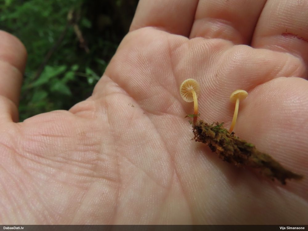 Man pēkšņi radās ideja - vai tur bija nu ļoti mitrs mikroklimats, egle ar melnalksni? Hipotētiski tādas dzeltenas var būt Diachea muscorum. Te bilde ir mazliet līdzīga: https://fr.wikipedia.org/wiki/Fichier:Craterium_muscorum,_Trawscoed,_North_Wales,_Aug_2016_-_Flickr_-_janetgraham84.jpg