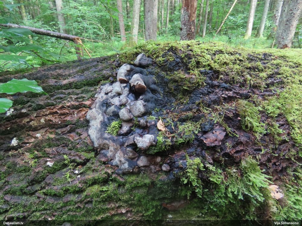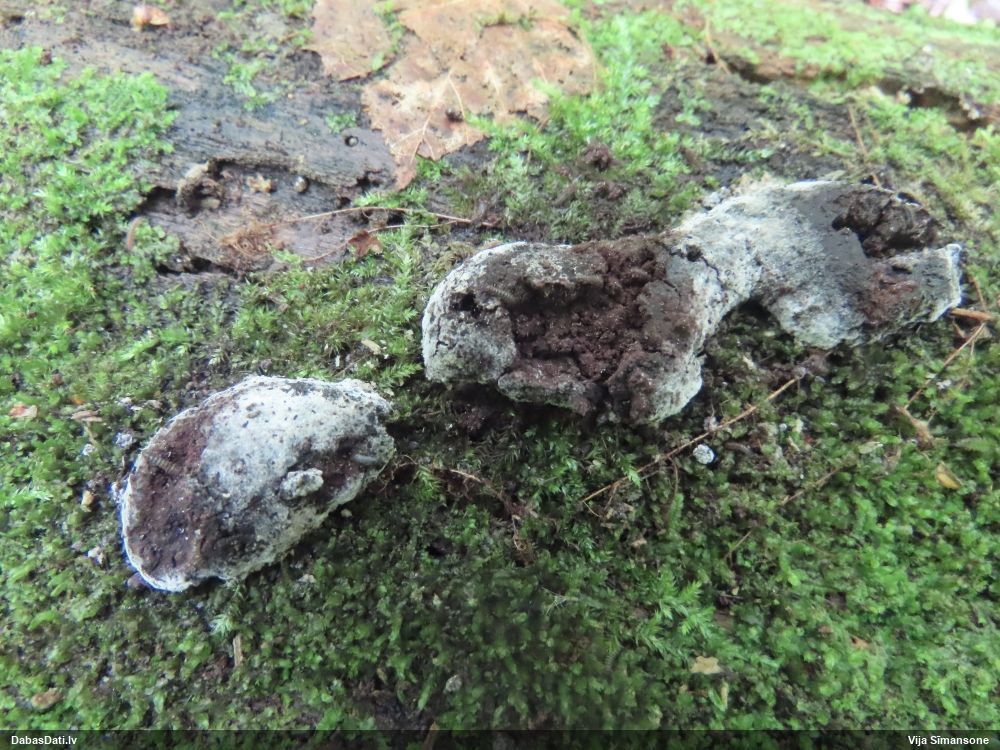 Šobrīd varu iedomāties 2 variantus - melnā plaispika Amaurochaete atra vai parastais gļotpūpēdis Reticularia lycoperdon. Pēc izmēra, augšanas laika un augšanas uz apstrādāta koka atbilst abas.