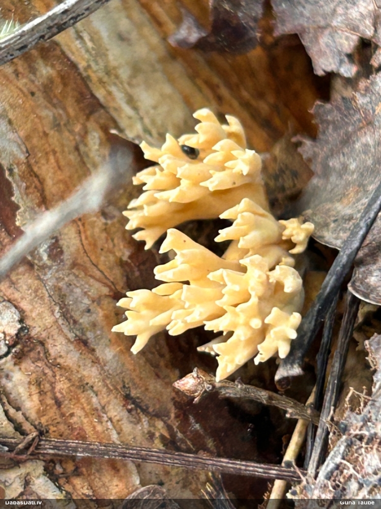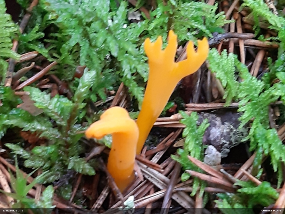 Priekš aurantiaca galīgi neatbilst jaunu augļķermeņu krāsa (kam sākumā jābūt zaļgani dzelteniem). Variants ir C.intricata, bet te mikroskopijā grūti saskatīt brīvo galu skaitu mezglos, tāpēc ātrumā droši noteikt nevaru.