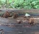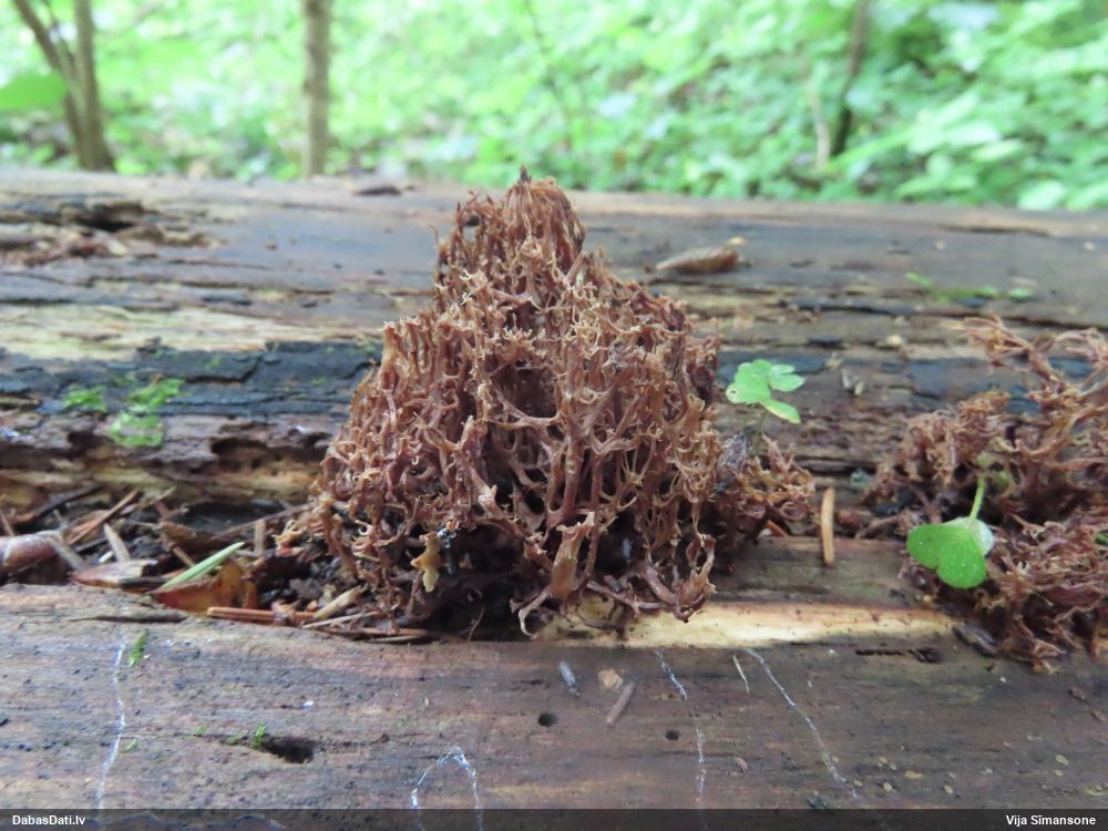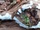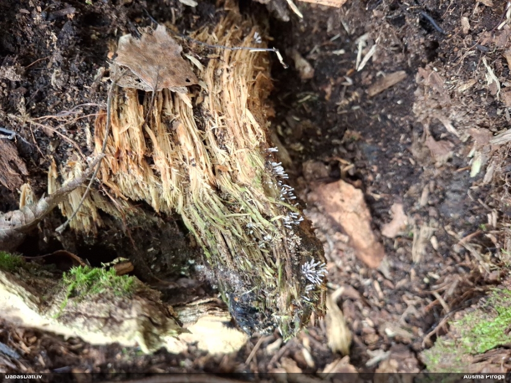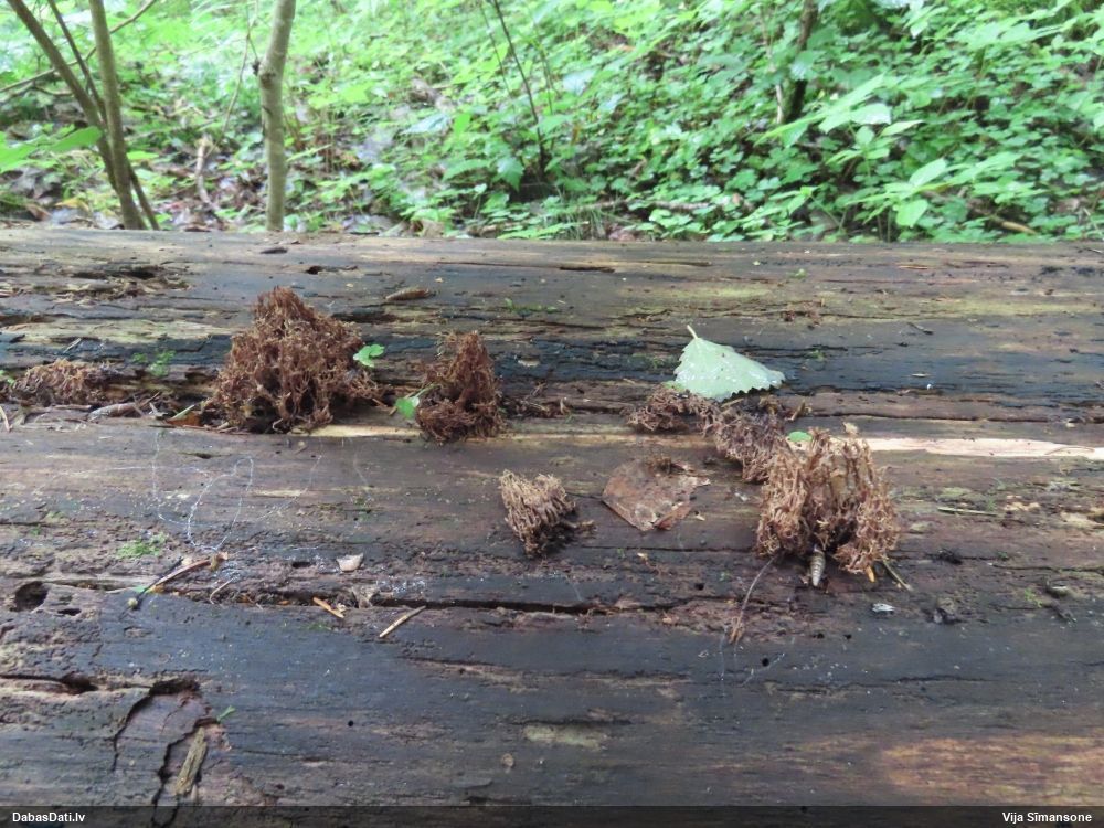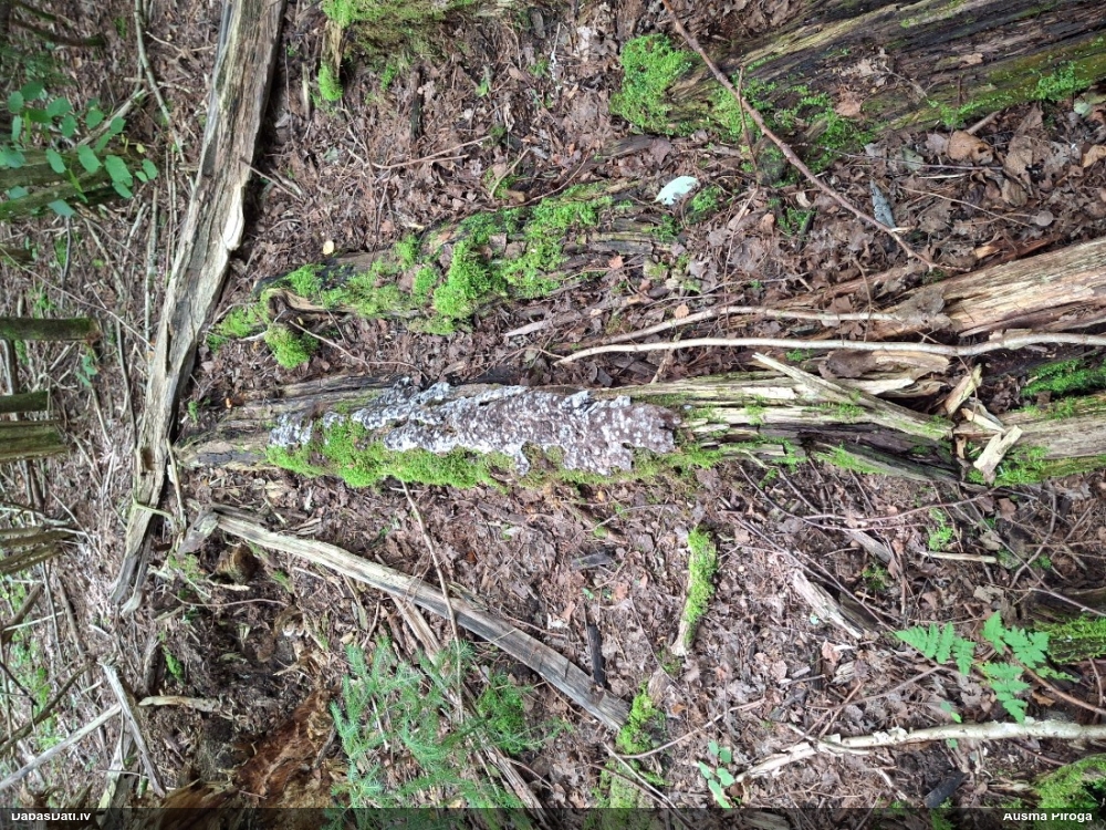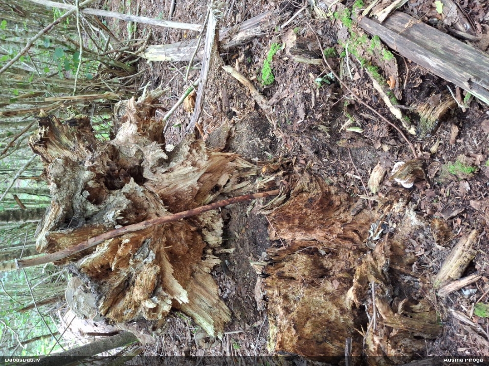 Satrūdējusi kritala mežā, nav dēļi. Iespējams, egle, jauktu koku mežs.