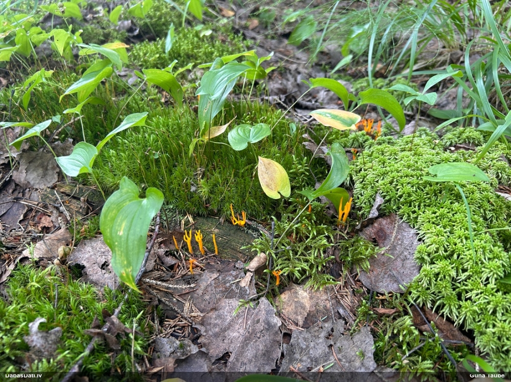 Man pēkšņi radās ideja - vai tur bija nu ļoti mitrs mikroklimats, egle ar melnalksni? Hipotētiski tādas dzeltenas var būt Diachea muscorum. Te bilde ir mazliet līdzīga: https://fr.wikipedia.org/wiki/Fichier:Craterium_muscorum,_Trawscoed,_North_Wales,_Aug_2016_-_Flickr_-_janetgraham84.jpg