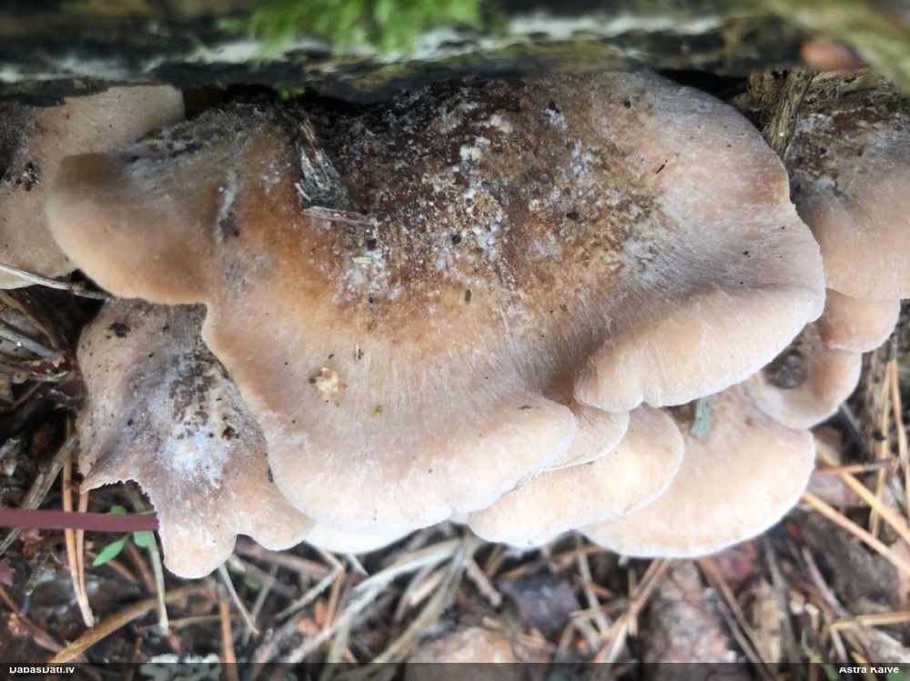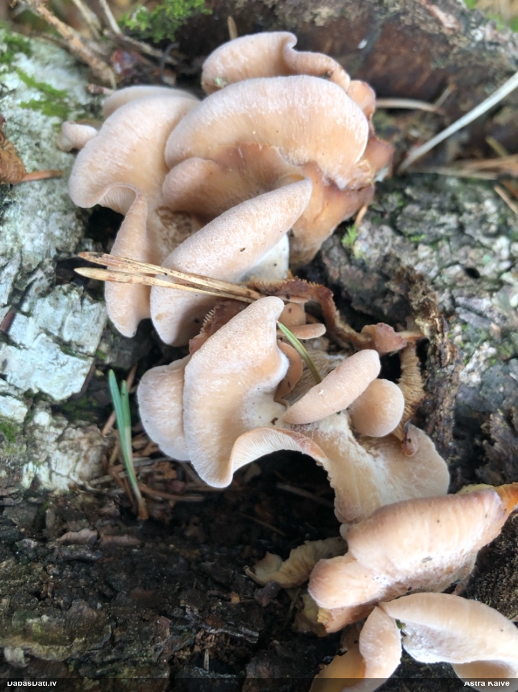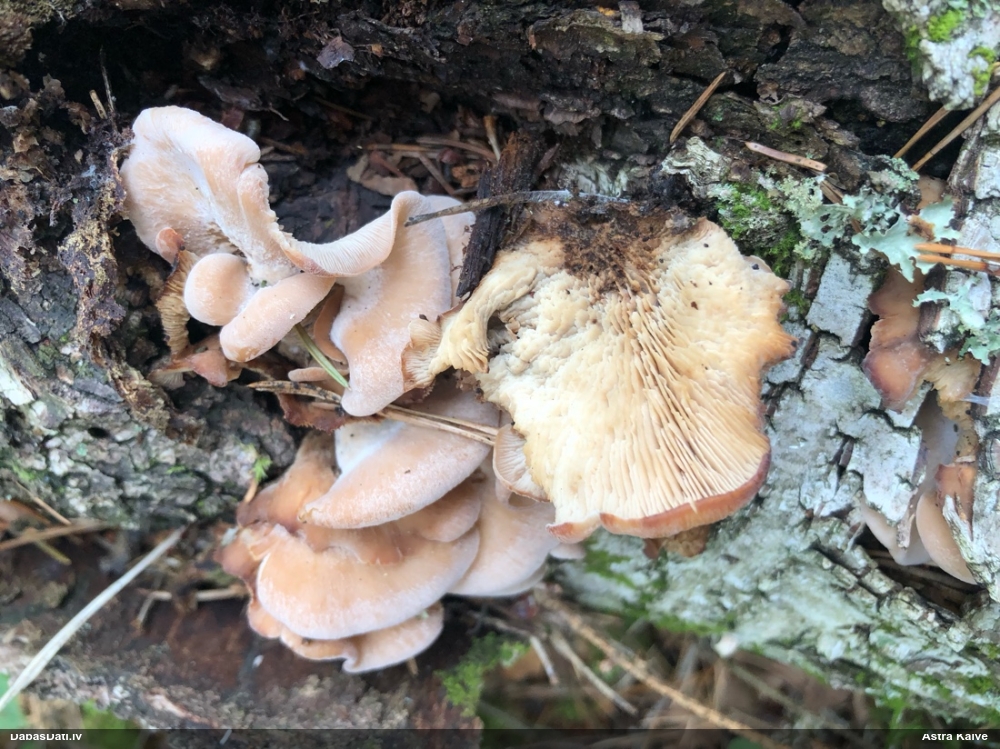 Es teiktu, ka Pleurotus cornucopiae: Cepurītes krāsa tik gaiši bēša nav pat vairākkārt salušām P.osteatus, bet šīs ir svaigi izaugušas. Lapiņas izteikti vērstas uz leju un veido kātiņa apakšā neregulāru rakstu, ko sauc par "anastomozes" tīklu.