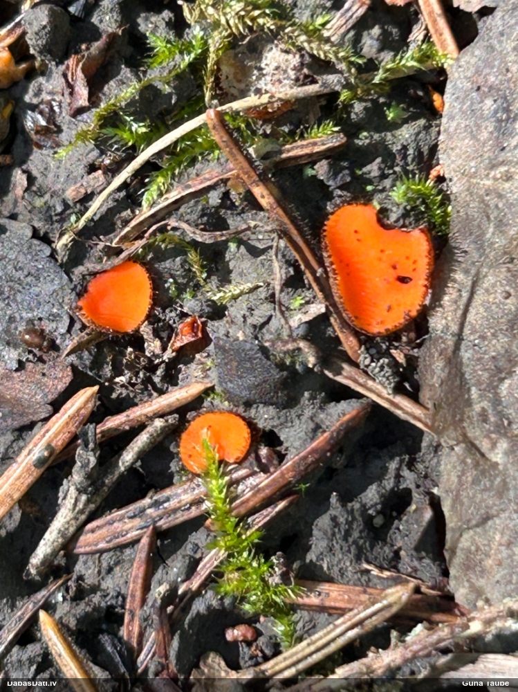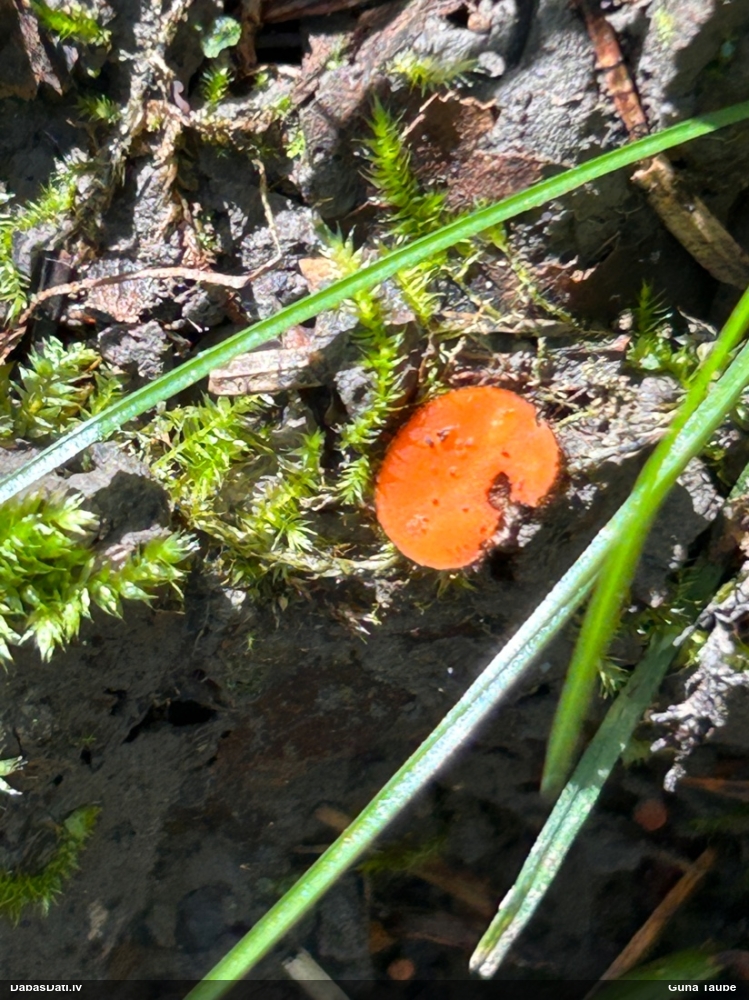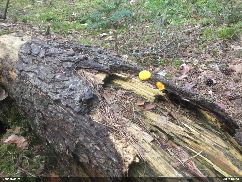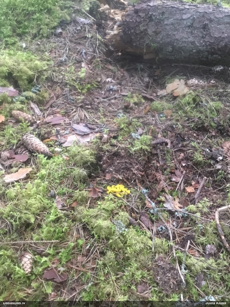 Man pēkšņi radās ideja - vai tur bija nu ļoti mitrs mikroklimats, egle ar melnalksni? Hipotētiski tādas dzeltenas var būt Diachea muscorum. Te bilde ir mazliet līdzīga: https://fr.wikipedia.org/wiki/Fichier:Craterium_muscorum,_Trawscoed,_North_Wales,_Aug_2016_-_Flickr_-_janetgraham84.jpg