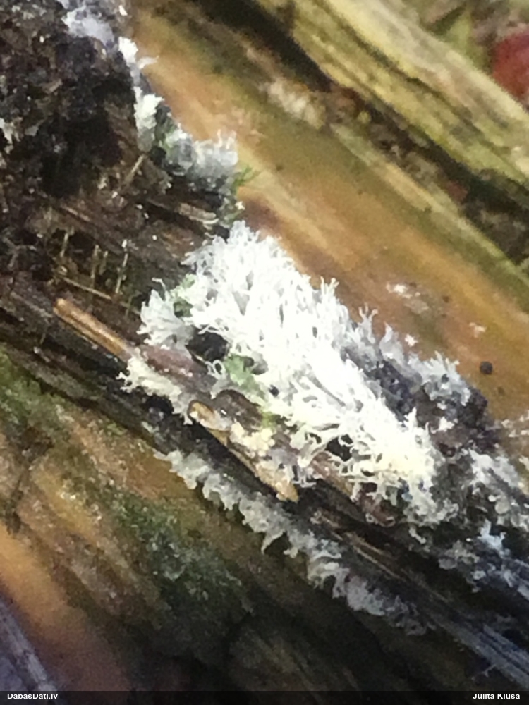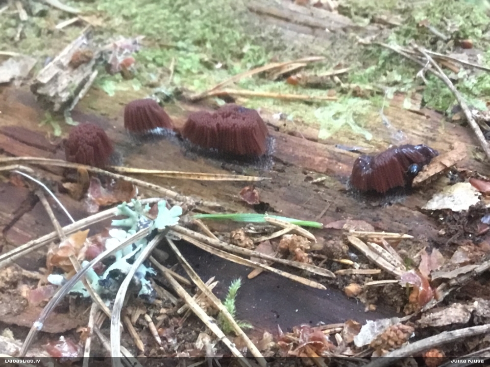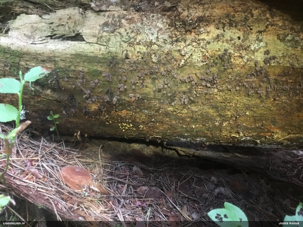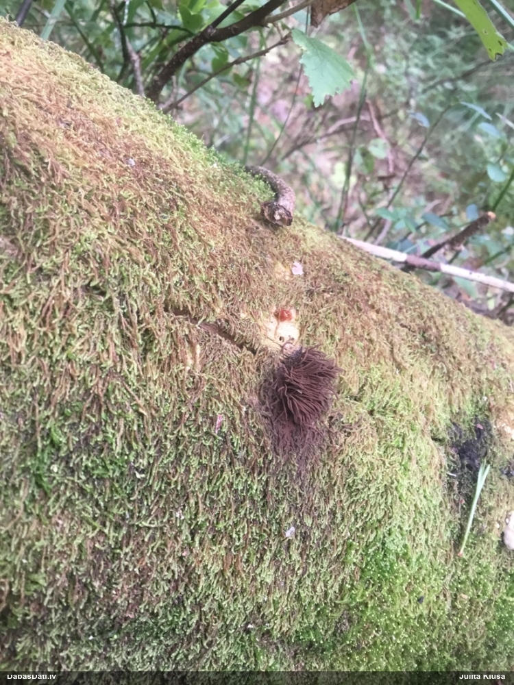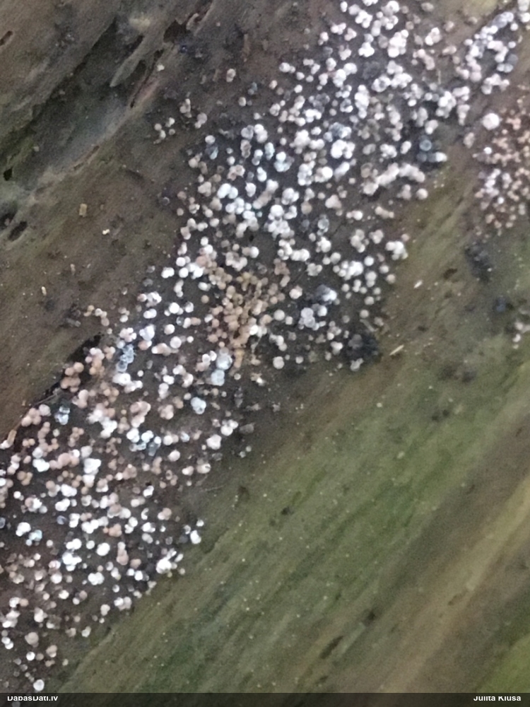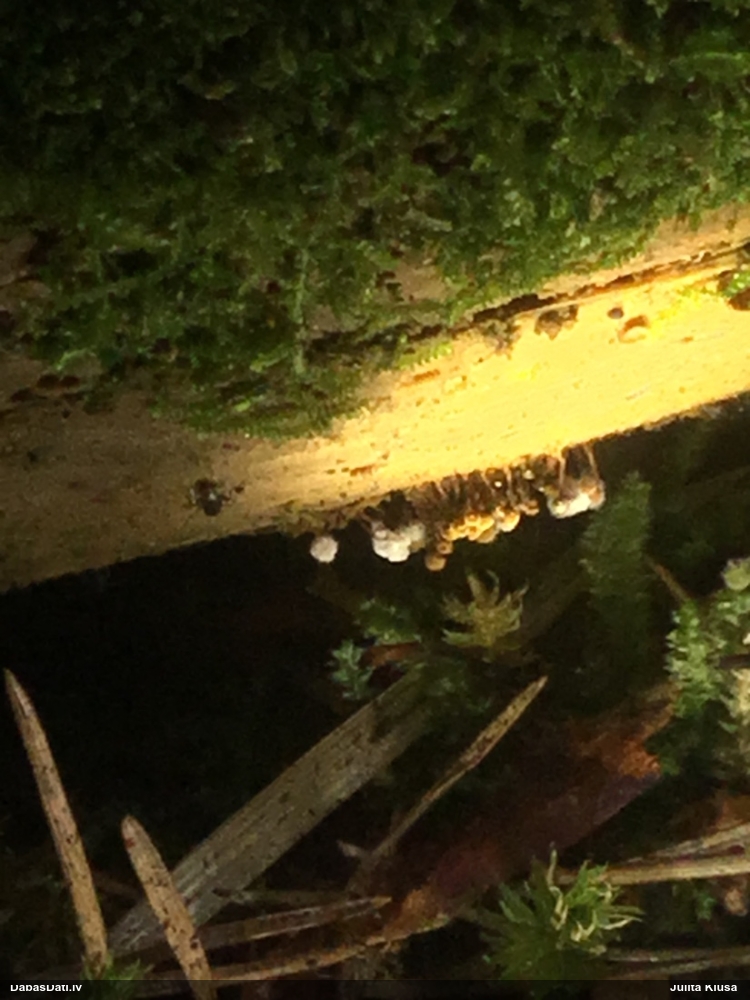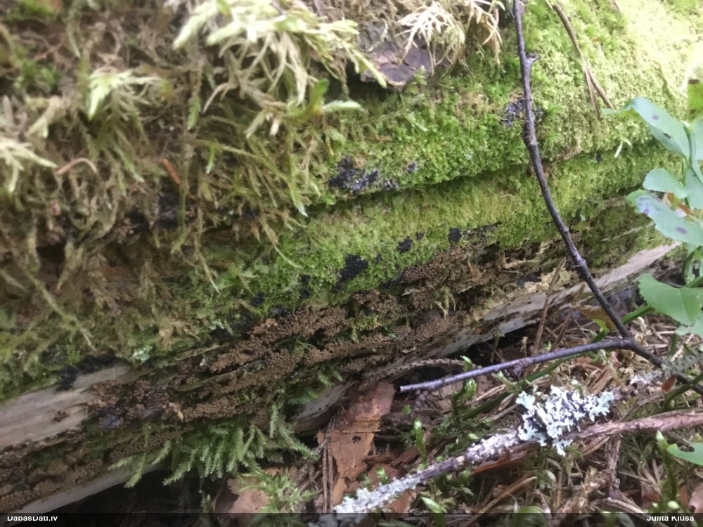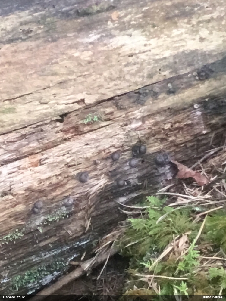 Šobrīd varu iedomāties 2 variantus - melnā plaispika Amaurochaete atra vai parastais gļotpūpēdis Reticularia lycoperdon. Pēc izmēra, augšanas laika un augšanas uz apstrādāta koka atbilst abas.