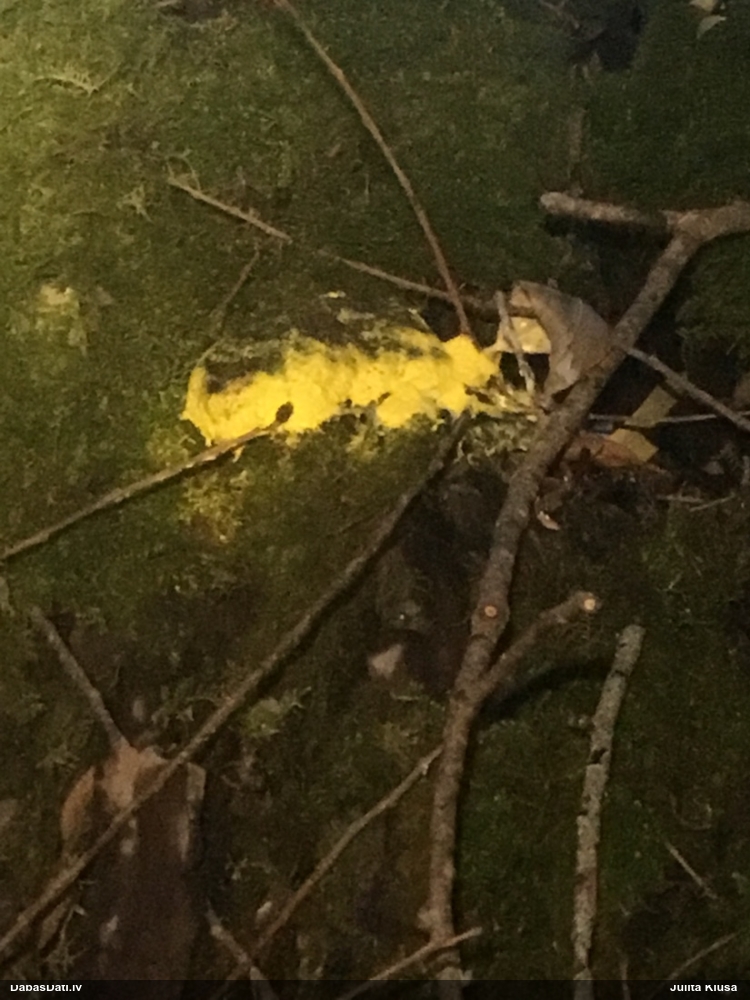 Man pēkšņi radās ideja - vai tur bija nu ļoti mitrs mikroklimats, egle ar melnalksni? Hipotētiski tādas dzeltenas var būt Diachea muscorum. Te bilde ir mazliet līdzīga: https://fr.wikipedia.org/wiki/Fichier:Craterium_muscorum,_Trawscoed,_North_Wales,_Aug_2016_-_Flickr_-_janetgraham84.jpg
