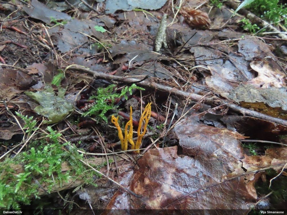 Priekš aurantiaca galīgi neatbilst jaunu augļķermeņu krāsa (kam sākumā jābūt zaļgani dzelteniem). Variants ir C.intricata, bet te mikroskopijā grūti saskatīt brīvo galu skaitu mezglos, tāpēc ātrumā droši noteikt nevaru.
