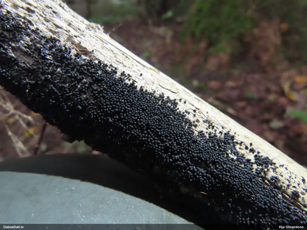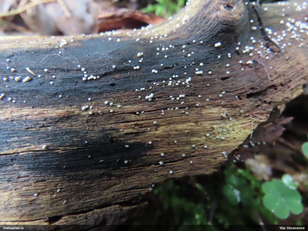 Šobrīd varu iedomāties 2 variantus - melnā plaispika Amaurochaete atra vai parastais gļotpūpēdis Reticularia lycoperdon. Pēc izmēra, augšanas laika un augšanas uz apstrādāta koka atbilst abas.