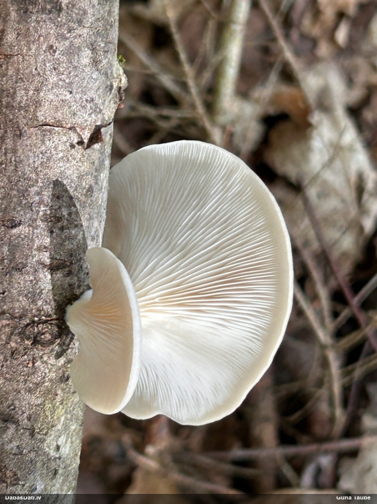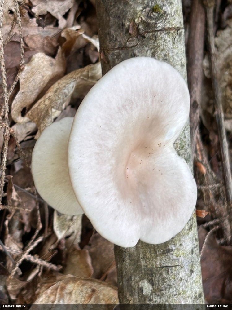 Es teiktu, ka Pleurotus cornucopiae: Cepurītes krāsa tik gaiši bēša nav pat vairākkārt salušām P.osteatus, bet šīs ir svaigi izaugušas. Lapiņas izteikti vērstas uz leju un veido kātiņa apakšā neregulāru rakstu, ko sauc par "anastomozes" tīklu.