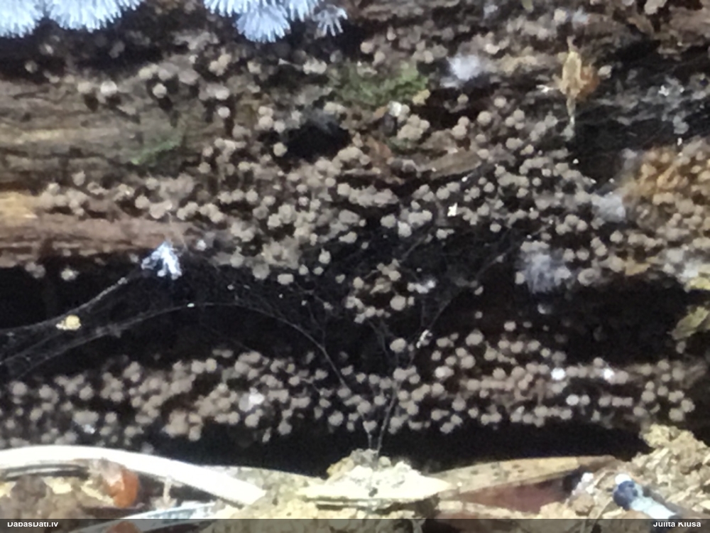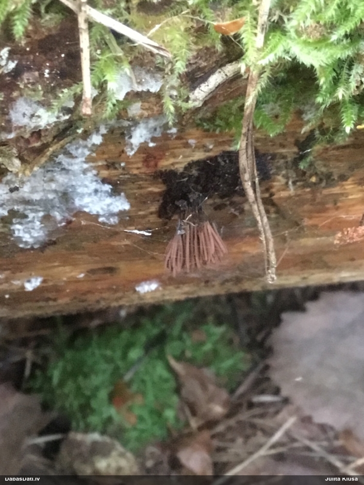 Šobrīd varu iedomāties 2 variantus - melnā plaispika Amaurochaete atra vai parastais gļotpūpēdis Reticularia lycoperdon. Pēc izmēra, augšanas laika un augšanas uz apstrādāta koka atbilst abas.