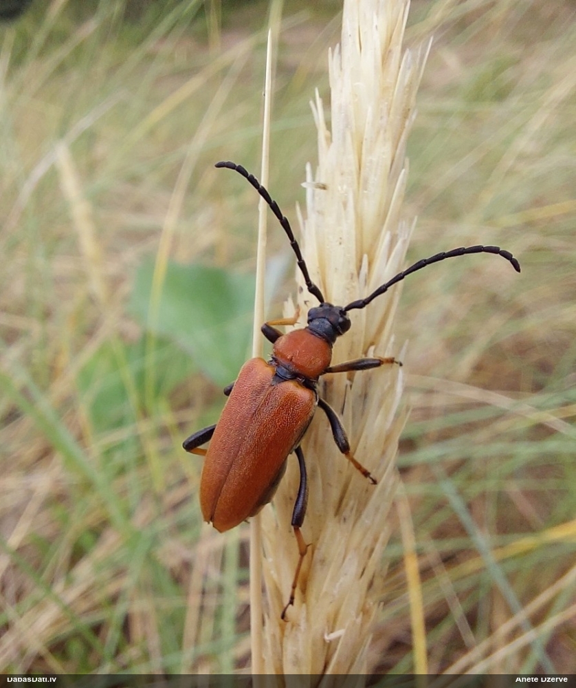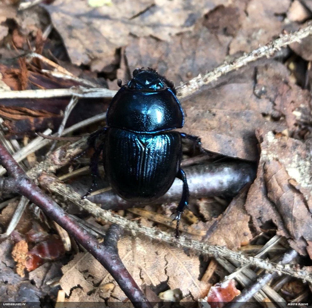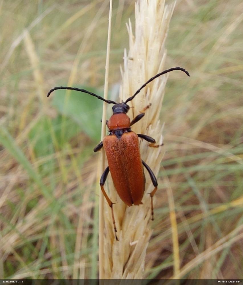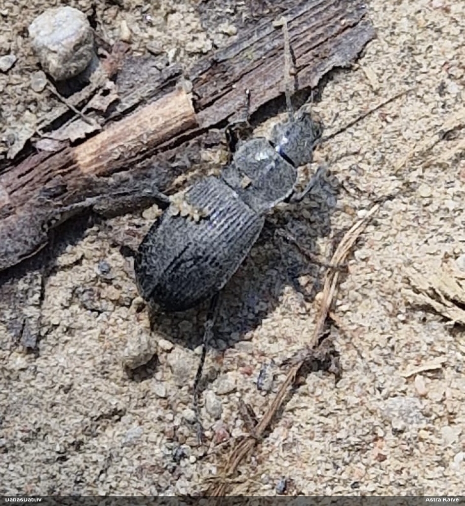 Jāredz tuvāk (kaut vai izkadrēts šis pats attēls) - varbūt tumšā eļļasvabole (Meloe proscarabaeus)