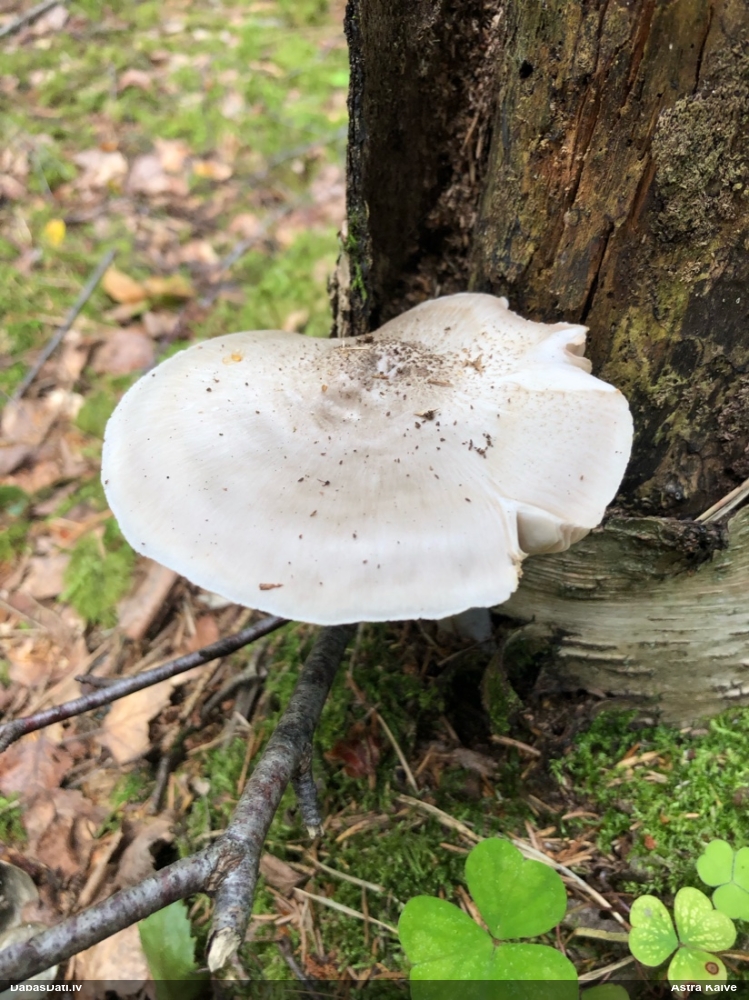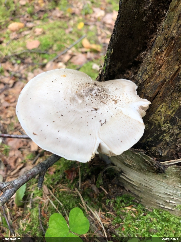 Es teiktu, ka Pleurotus cornucopiae: Cepurītes krāsa tik gaiši bēša nav pat vairākkārt salušām P.osteatus, bet šīs ir svaigi izaugušas. Lapiņas izteikti vērstas uz leju un veido kātiņa apakšā neregulāru rakstu, ko sauc par "anastomozes" tīklu.