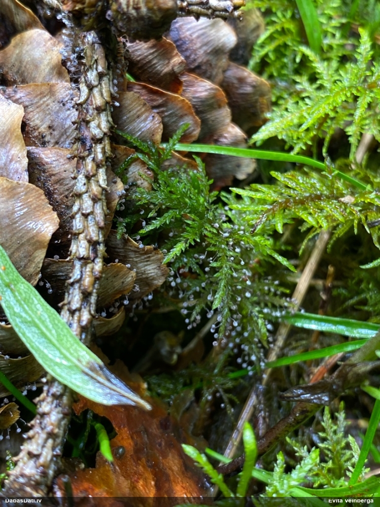 Man pēkšņi radās ideja - vai tur bija nu ļoti mitrs mikroklimats, egle ar melnalksni? Hipotētiski tādas dzeltenas var būt Diachea muscorum. Te bilde ir mazliet līdzīga: https://fr.wikipedia.org/wiki/Fichier:Craterium_muscorum,_Trawscoed,_North_Wales,_Aug_2016_-_Flickr_-_janetgraham84.jpg