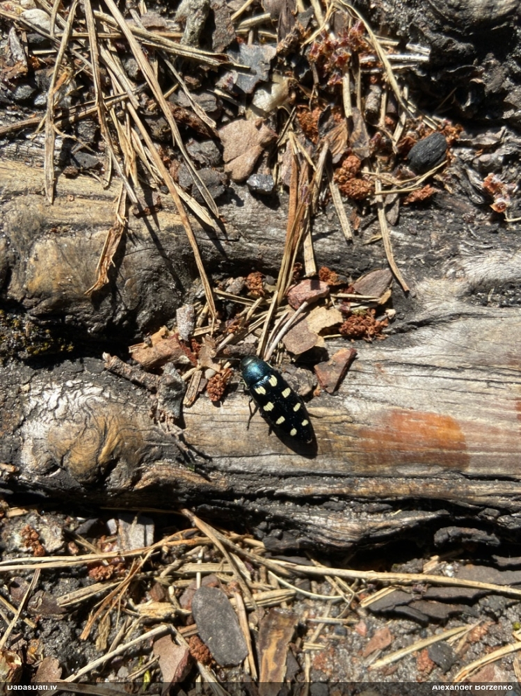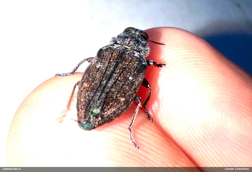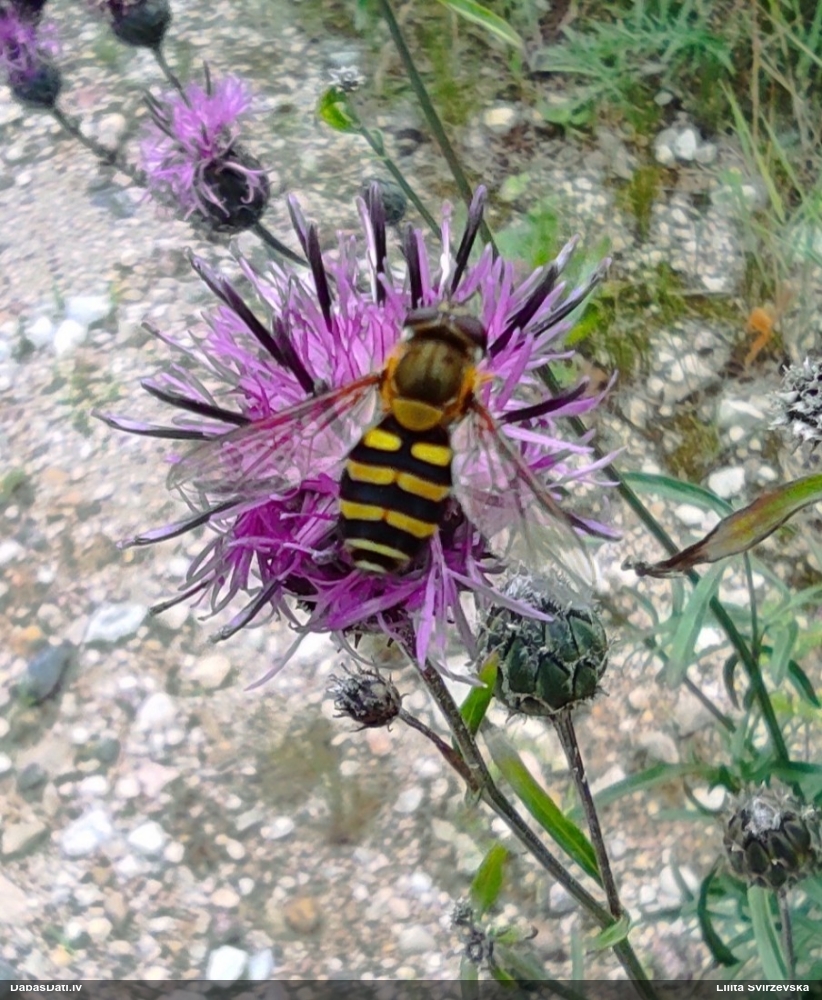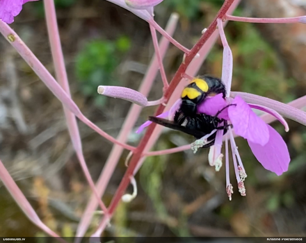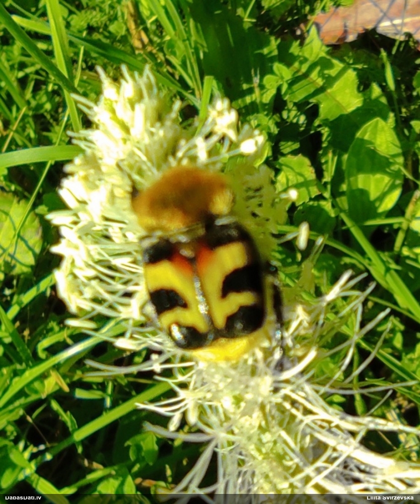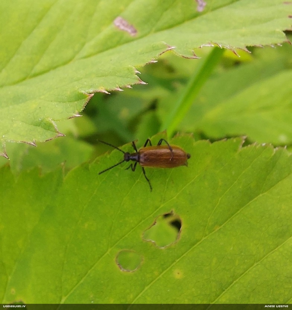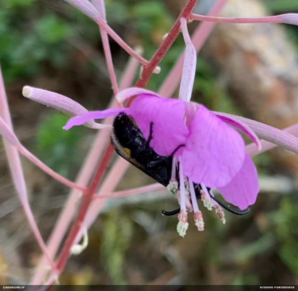 Jāredz tuvāk (kaut vai izkadrēts šis pats attēls) - varbūt tumšā eļļasvabole (Meloe proscarabaeus)